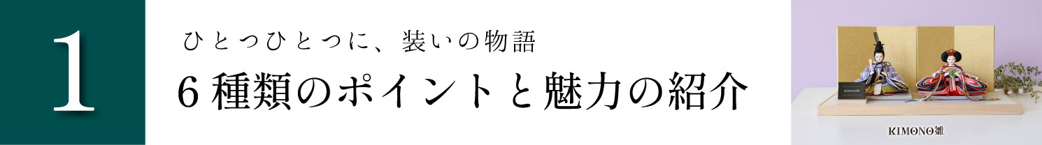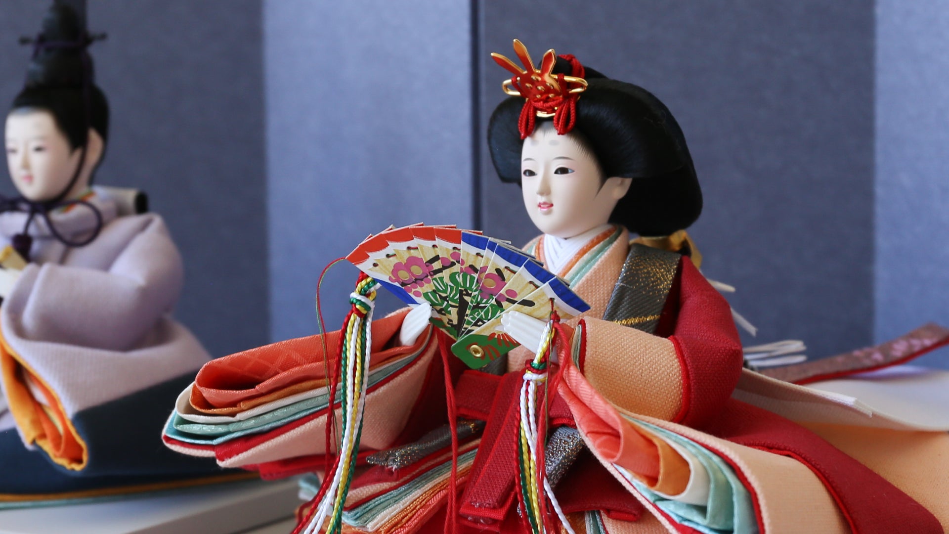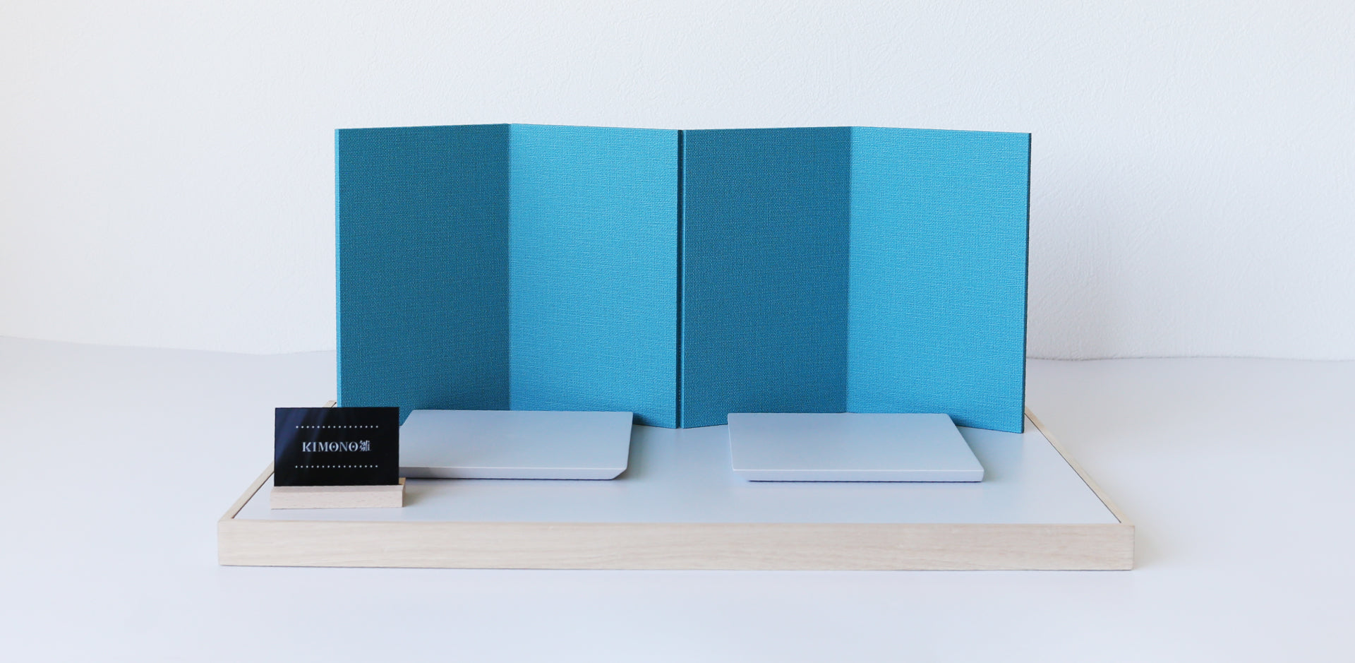 The layered costumes in muted colors and the screens and name cards that make use of texture enhance the presence of the KIMONO Hina dolls.
