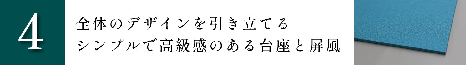 The accent colors subtly add a touch of glamour, elevating Japanese elements to a more modern look. The somewhat stoic yet sophisticated atmosphere complements any sophisticated space.