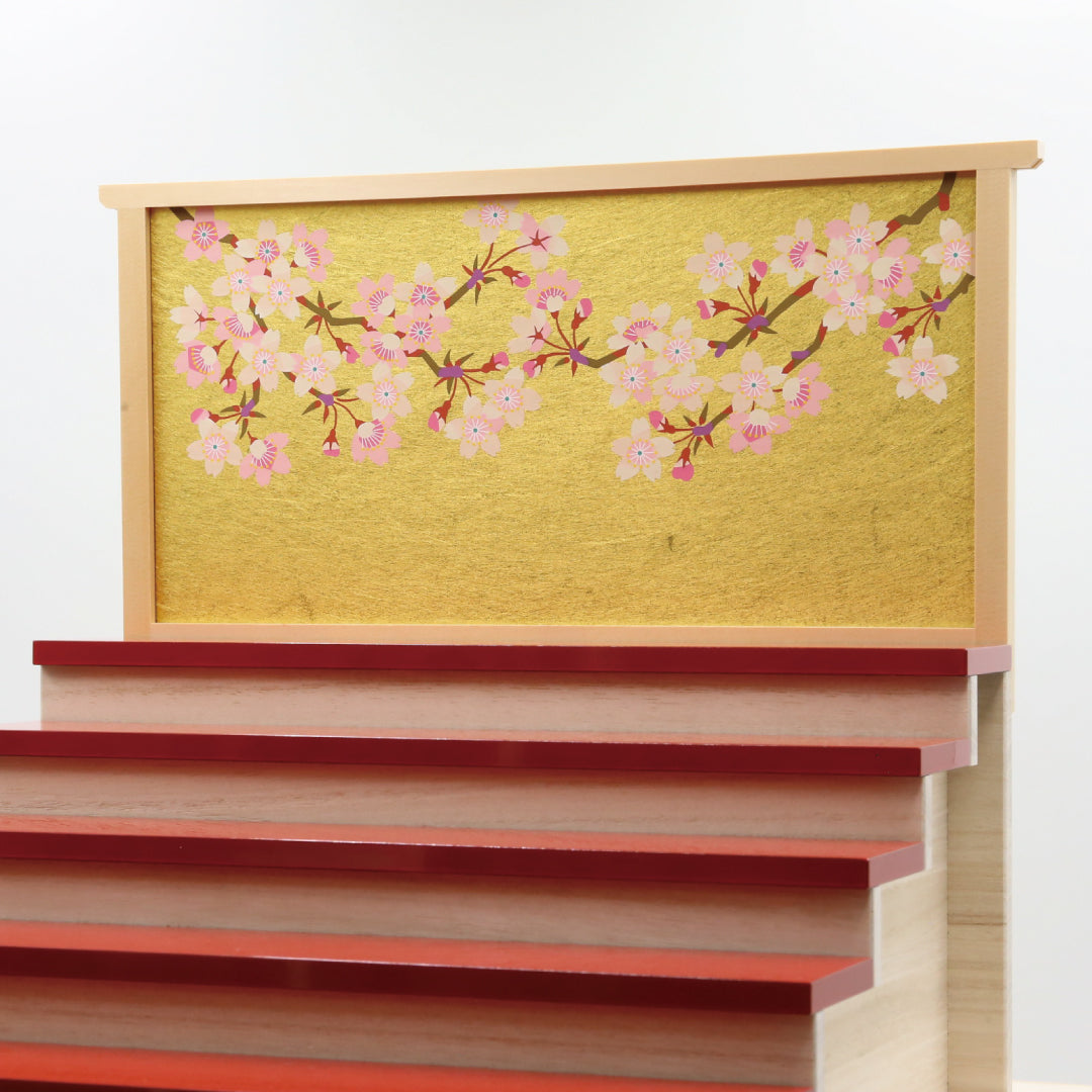 桜咲く屏風と段飾りが描く、春の晴れ景色