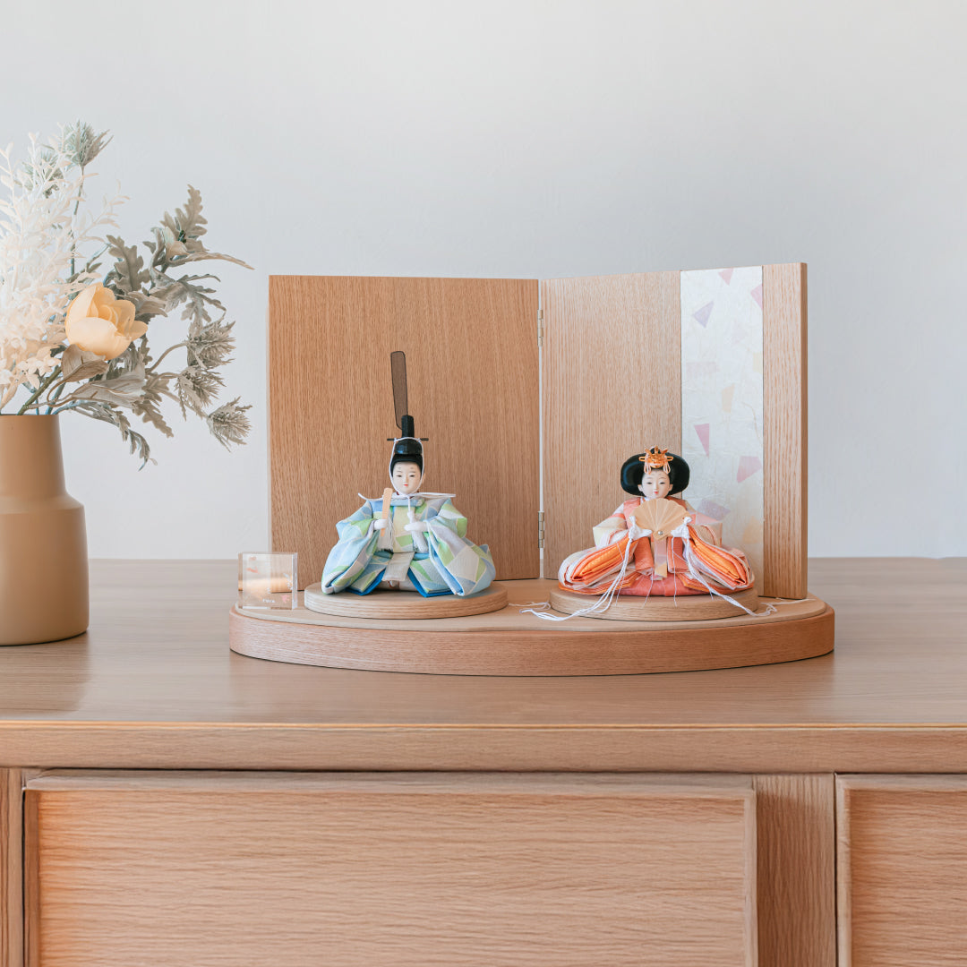 The warm wooden pedestal and the vertical design of a simple two-fold folding screen give it a compact yet spacious feel, highlighting the cute dolls.