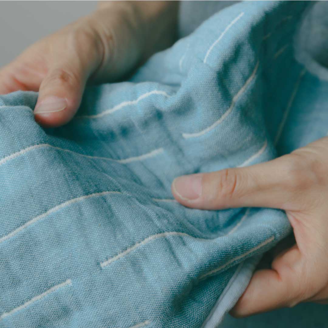 After weaving a regular gauze blanket, the glue attached to the threads is washed to remove it, and then the blanket is sewn to complete the process, but BLANKED goes further by washing each blanket individually to give it outstanding absorbency. At a dyeing factory in Ehime Prefecture, the cotton is thoroughly decomposed by enzymes to remove impurities such as cotton wax and glue, and the blanket is washed and finished with plenty of underground water from Mt. Ishizuchi, which has been selected as one of Japan's 100 famous waters.