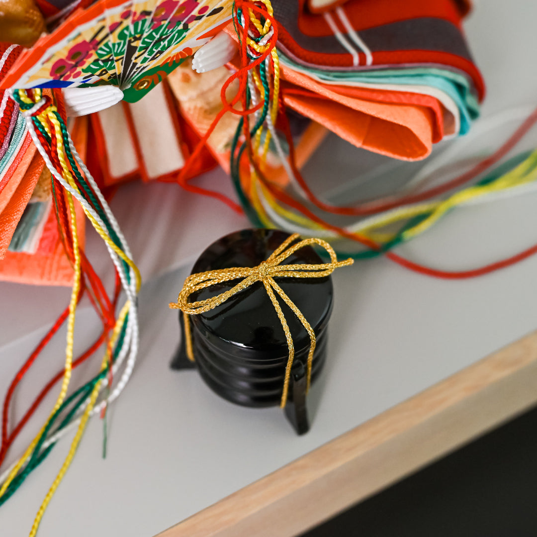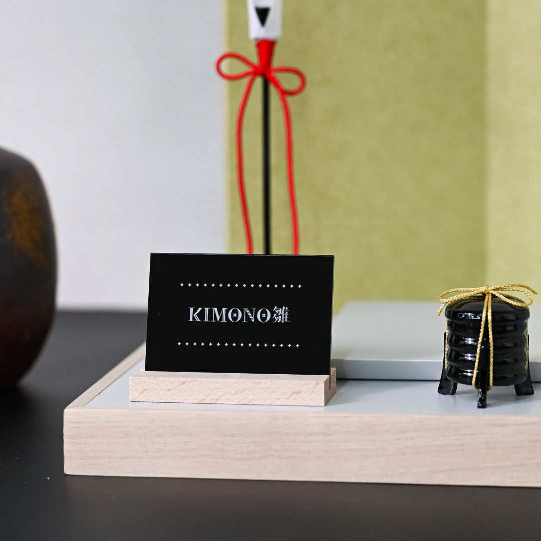 The KIMONO logo, which has a modern yet somewhat retro image, is painted on a glossy black acrylic Hinamatsuri stand. Compared to the colorful KIMONO Hina dolls, the chic and simple impression of the work card further enhances the worldview.