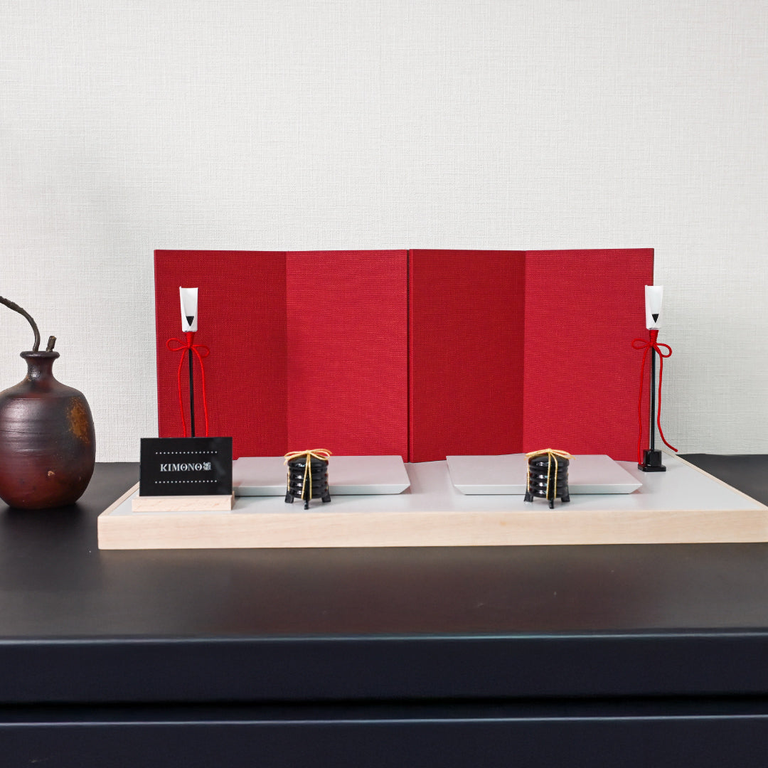 The texture of the folding screen, costumes, and name card stands out, making the Kimono Hina dolls even more striking. The layered costumes are kept chic while accentuating the accent colors, creating a modern Japanese, stoic, and fashionable design and interior. Enjoy the classic and fashionable world view that only Kimono Hina dolls can offer.