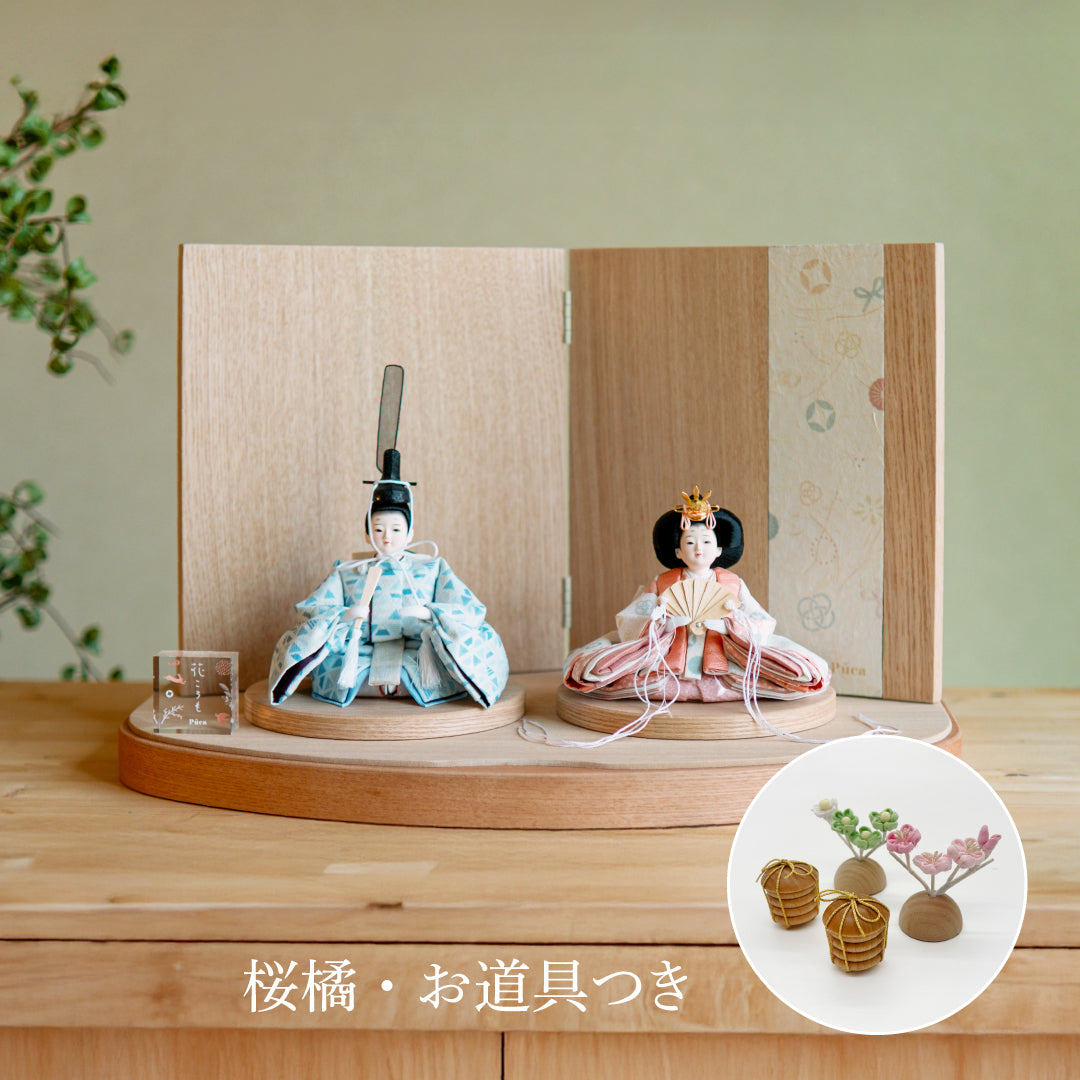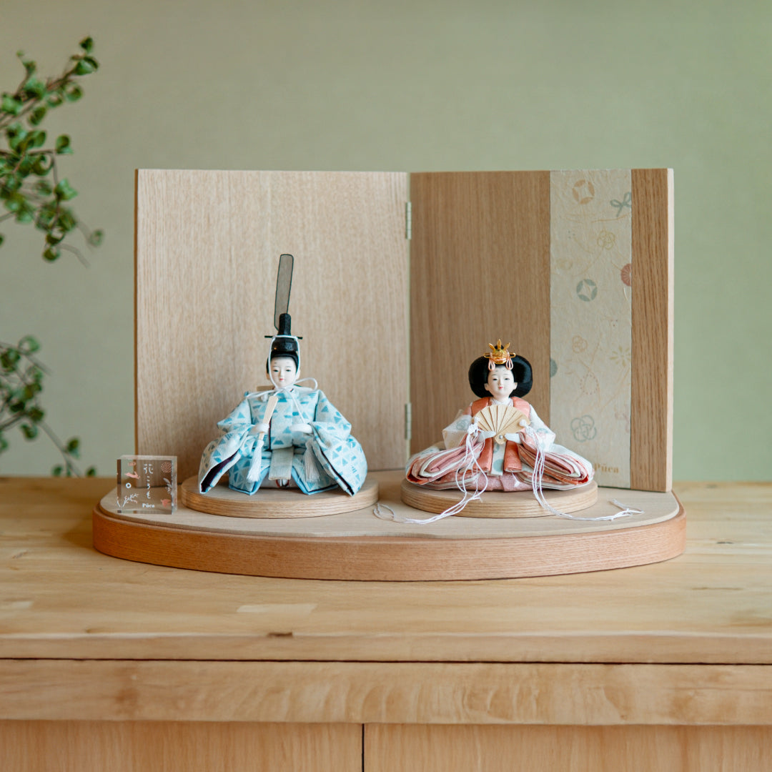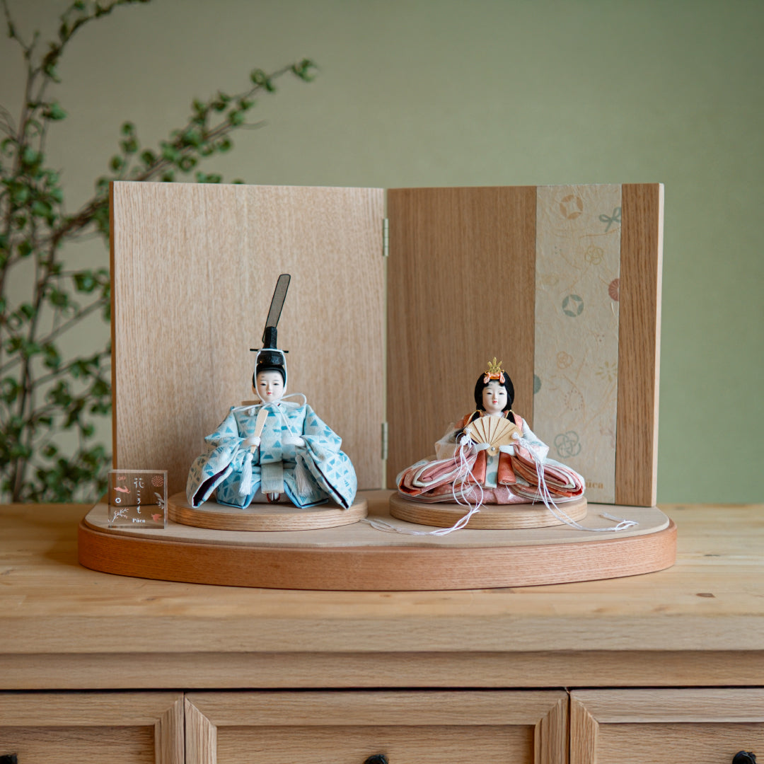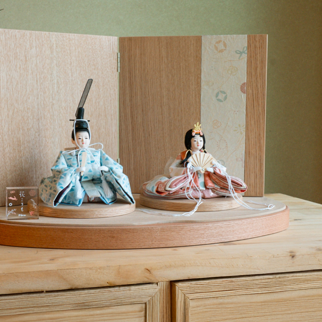 The warm wooden pedestal and the vertical design of a simple two-fold folding screen give it a compact yet spacious feel, highlighting the cute dolls.