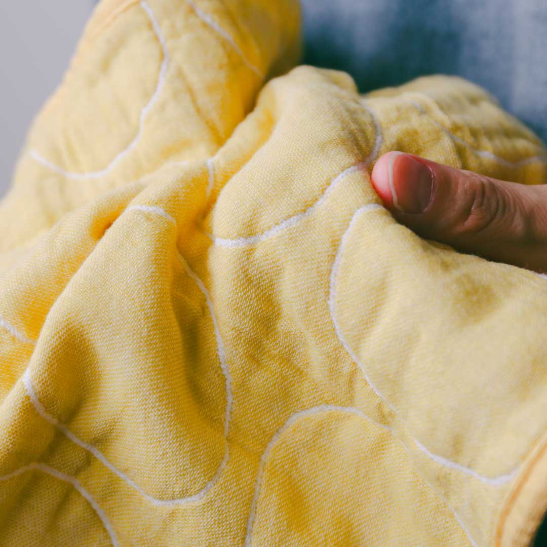 Après avoir tissé une couverture en gaze ordinaire, l'amidon adhérant aux fils est lavé pour être éliminé, puis la couverture est cousue pour terminer le processus. Cependant, BLANKED va plus loin et lave chaque couverture individuellement pour lui donner une capacité d'absorption exceptionnelle. Dans une usine de teinture de la préfecture d'Ehime, des enzymes sont utilisées pour décomposer complètement les impuretés telles que la cire de coton et la colle du coton, et le tissu est ensuite lavé et fini en utilisant beaucoup d'eau souterraine du mont Ishizuchi, qui a été sélectionnée comme l'une des 100 eaux célèbres du Japon.