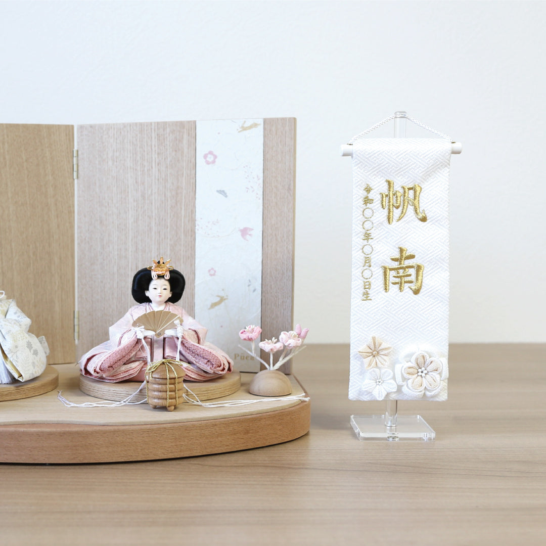 白基調のため空間を圧迫せず、写真撮影でも美しく映える名前旗です。