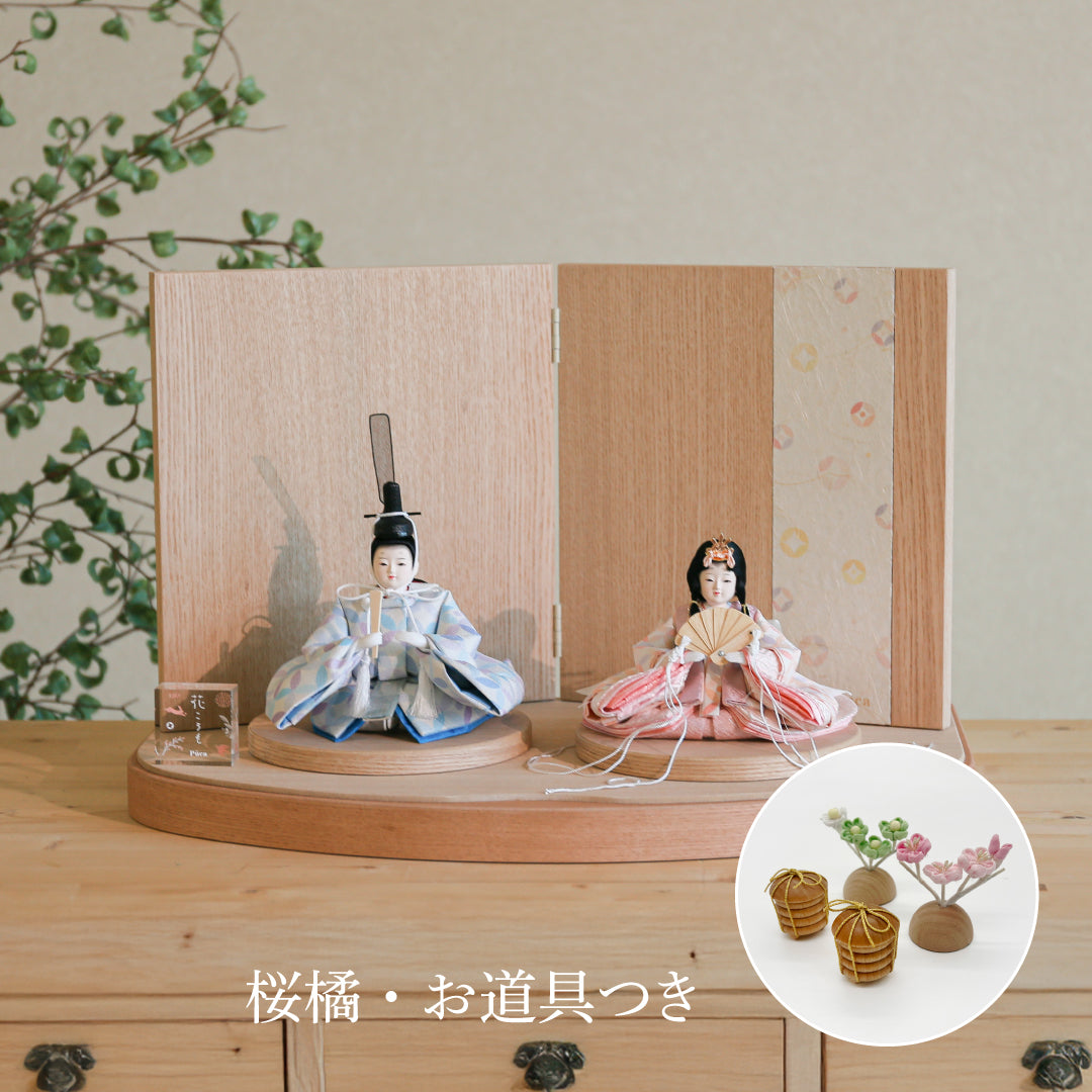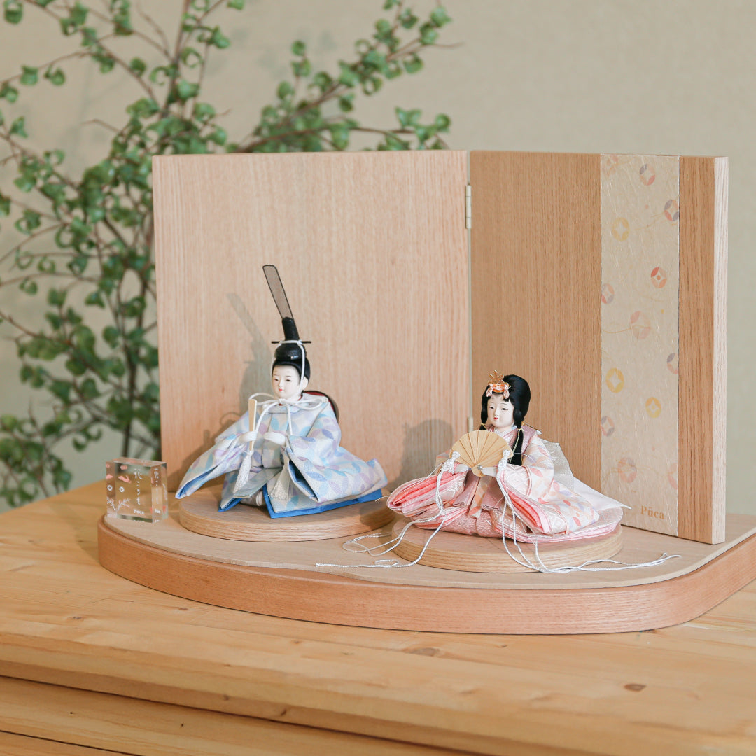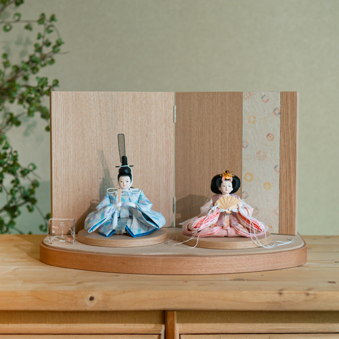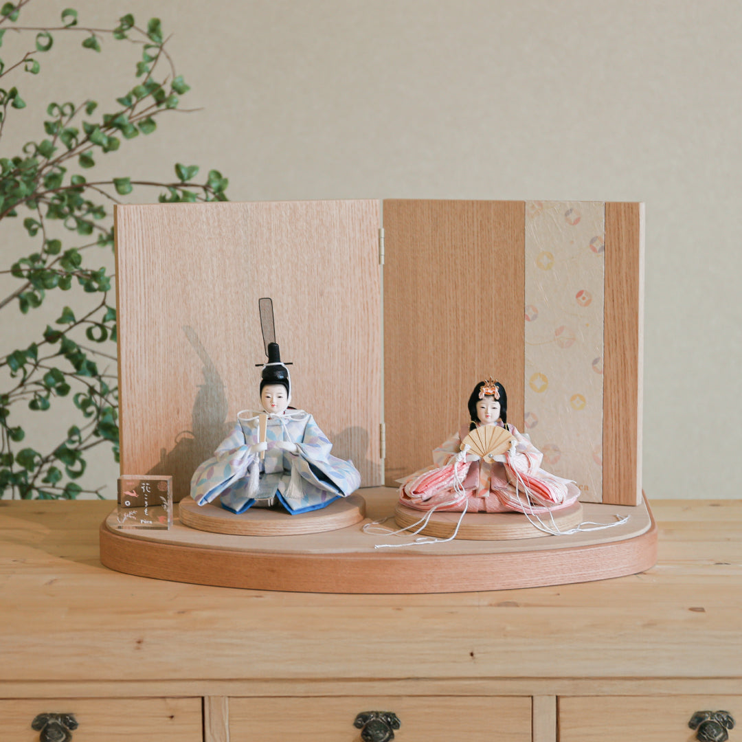 Le paravent simple, long et vertical, à deux panneaux, est placé sur une base en bois chaleureuse et est compact mais spacieux, mettant en valeur la silhouette adorable des poupées Hina.