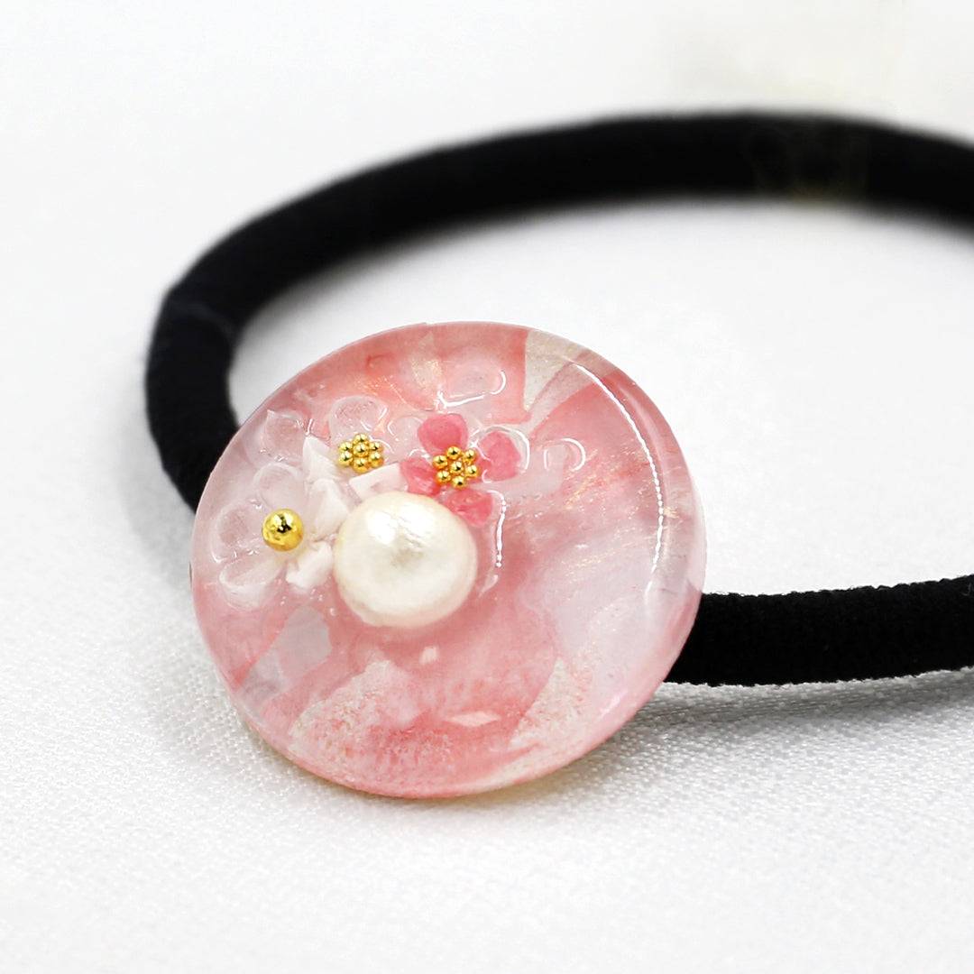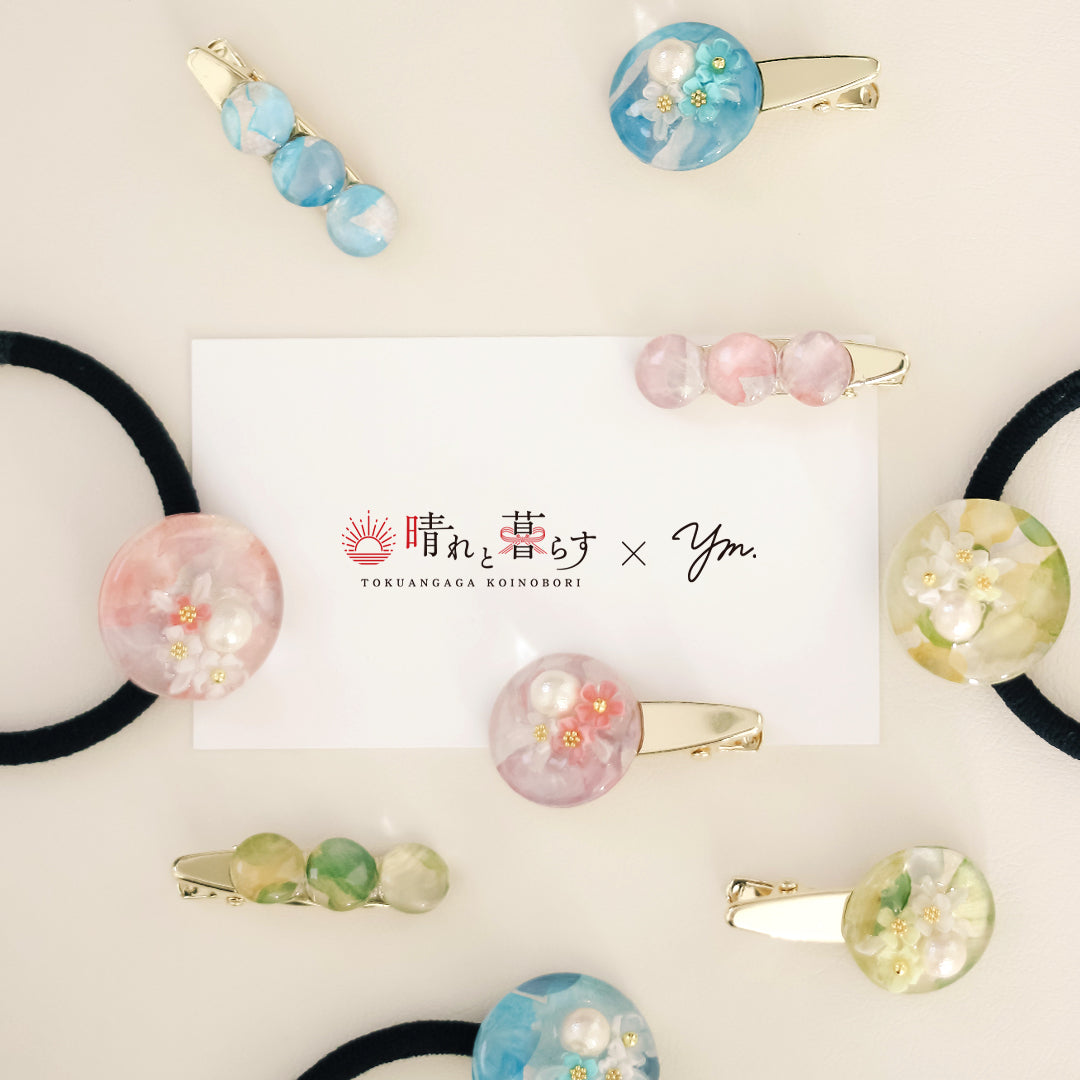 Les accessoires d'ym. sont attrayants avec leurs aquarelles magnifiques et intemporelles, leur résine transparente et leur délicat travail de crêpe. Les accessoires sont créés par deux personnes (en fait une mère et sa fille !) : Matsu-san, qui est en charge du travail des boutons, et Omisa-san, qui s'occupe de l'aquarelle et de la résine. Les deux discutent du design, des couleurs et des combinaisons de toutes les pièces, et le design à lui seul prend beaucoup de temps à créer.