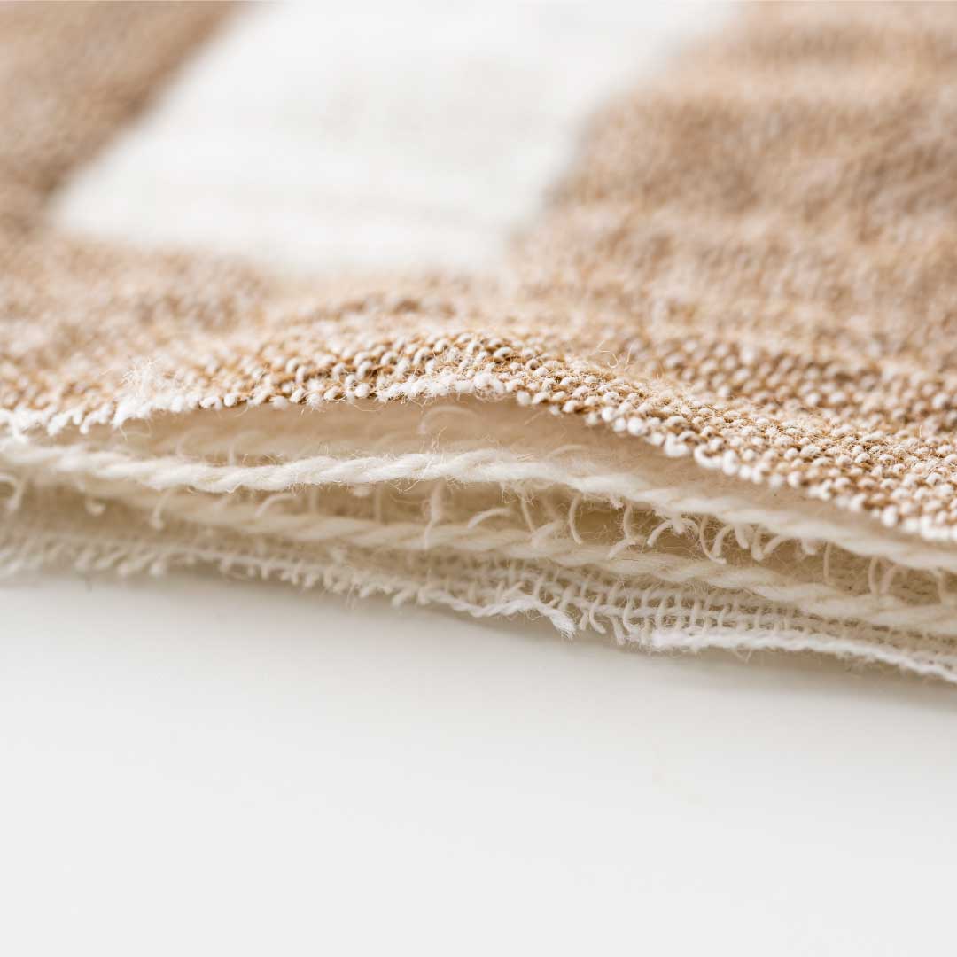 表裏は肌に当たった時に気持ちがいいように細かい糸で織り、中の2層は太い糸でざっくり織ることで、あまり重ねずにボリュームが出るだけでなく、通気性がよく乾きやすいガーゼになります。