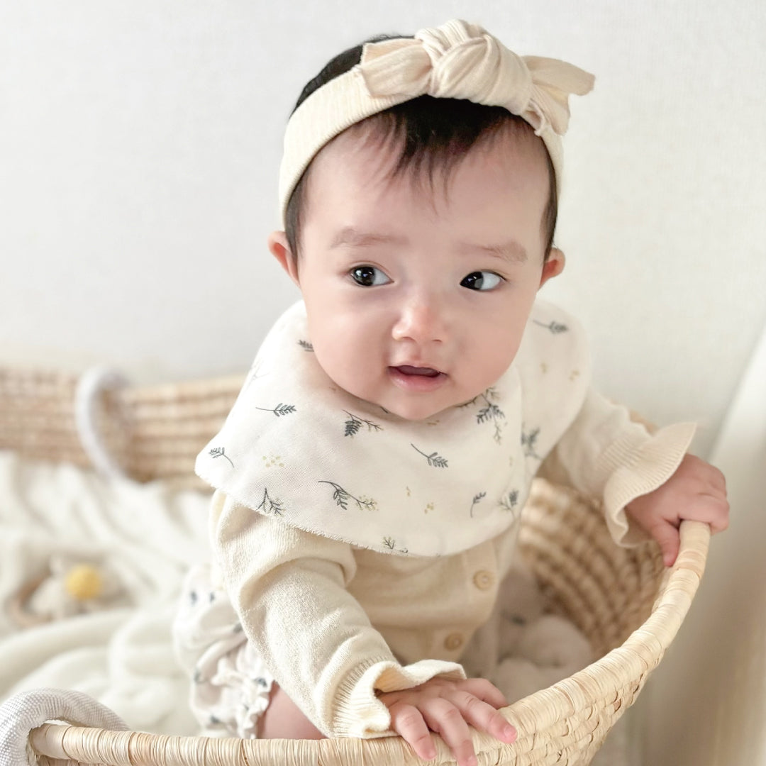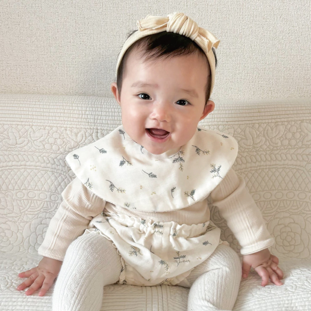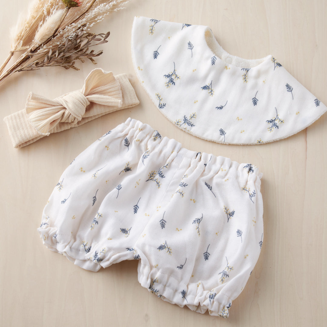 スタイ、ブルマ、ヘアバンドの3点が揃った、うれしいセット。統一感のあるデザインで、簡単に可愛いベビーファッションが完成します。お出かけ・記念フォト・お呼ばれにもぴったり。