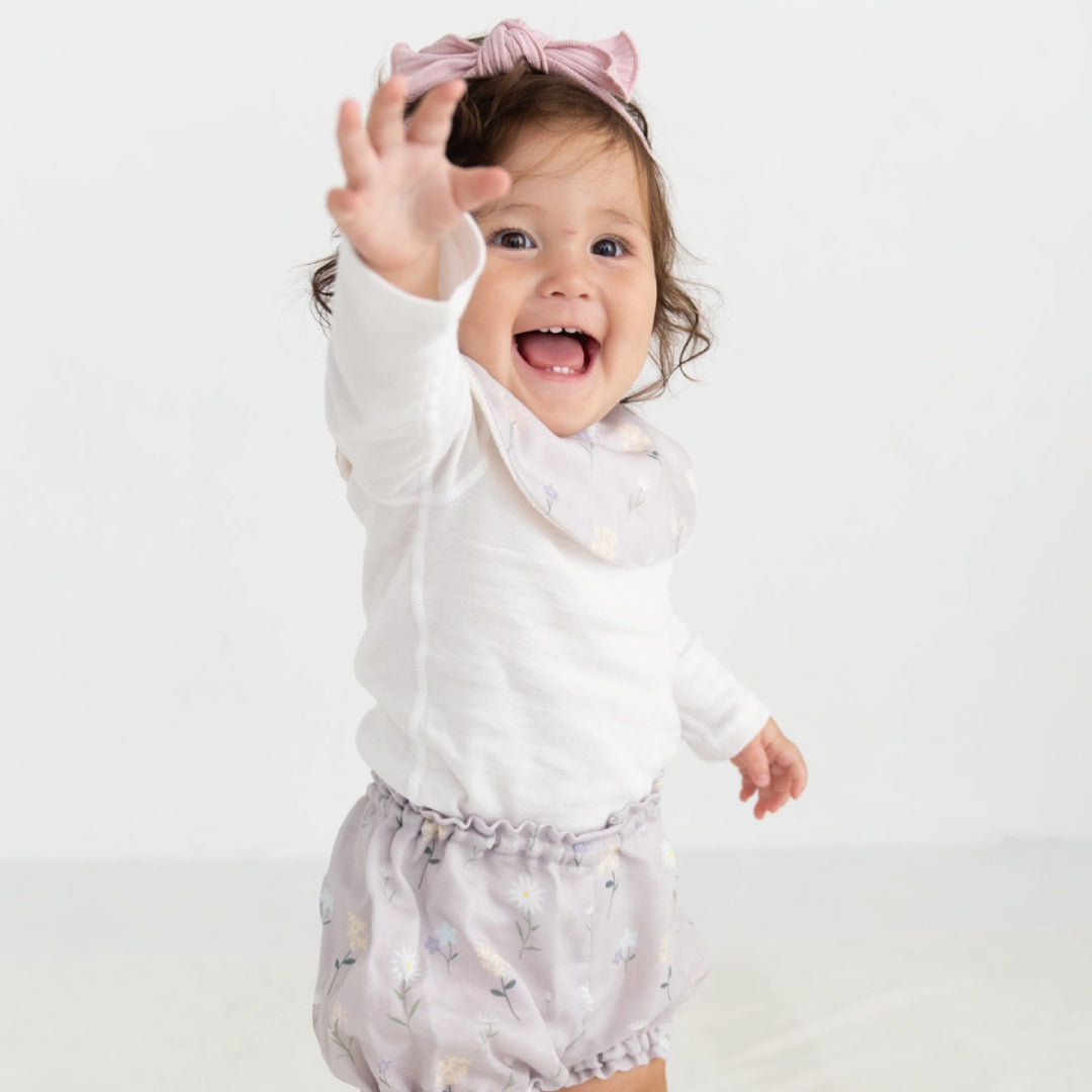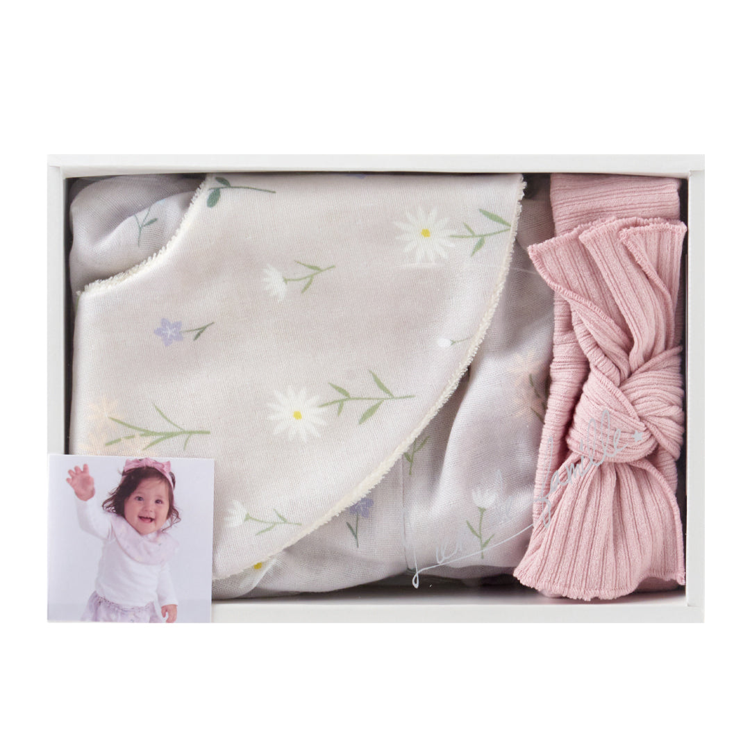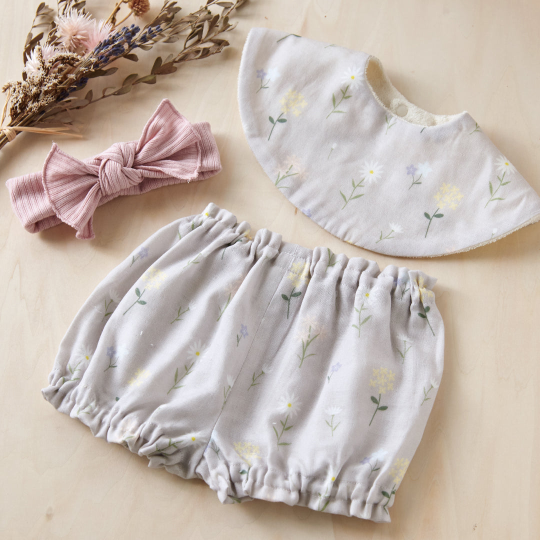 スタイ、ブルマ、ヘアバンドの3点が揃った、うれしいセット。統一感のあるデザインで、簡単に可愛いベビーファッションが完成します。お出かけ・記念フォト・お呼ばれにもぴったり。