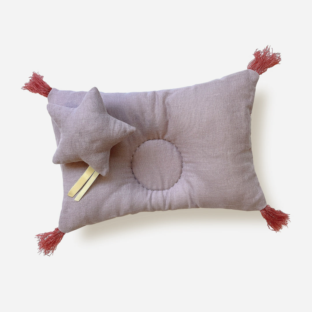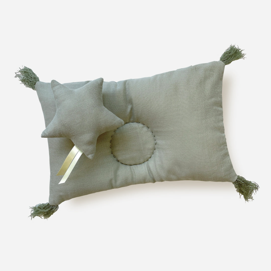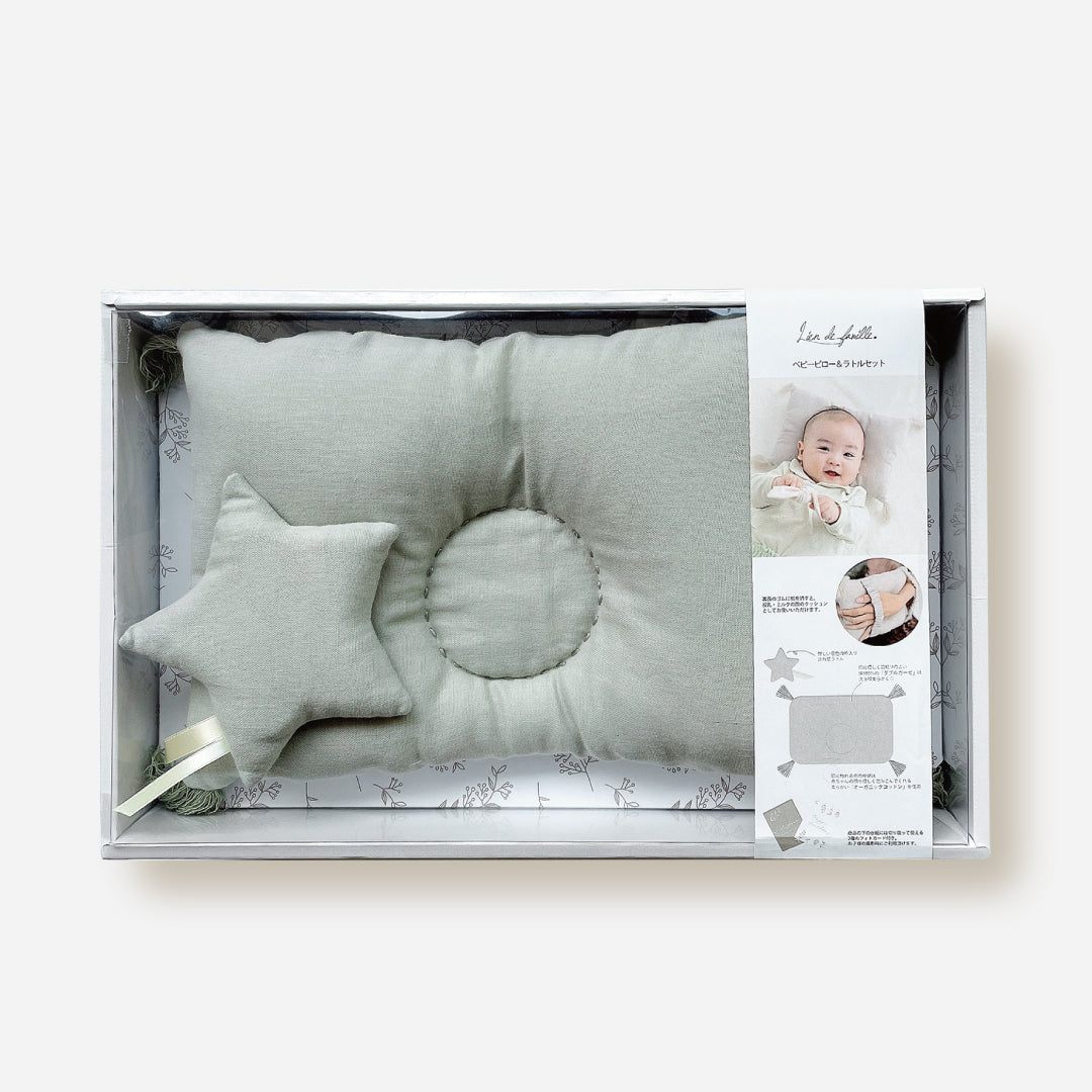 ベビーピローとスターラトルがセットになった、贈り物にもぴったりのアイテムです。ふんわり包み込む素材と落ち着いたカラーが、赤ちゃんのお部屋にやさしく馴染みます。