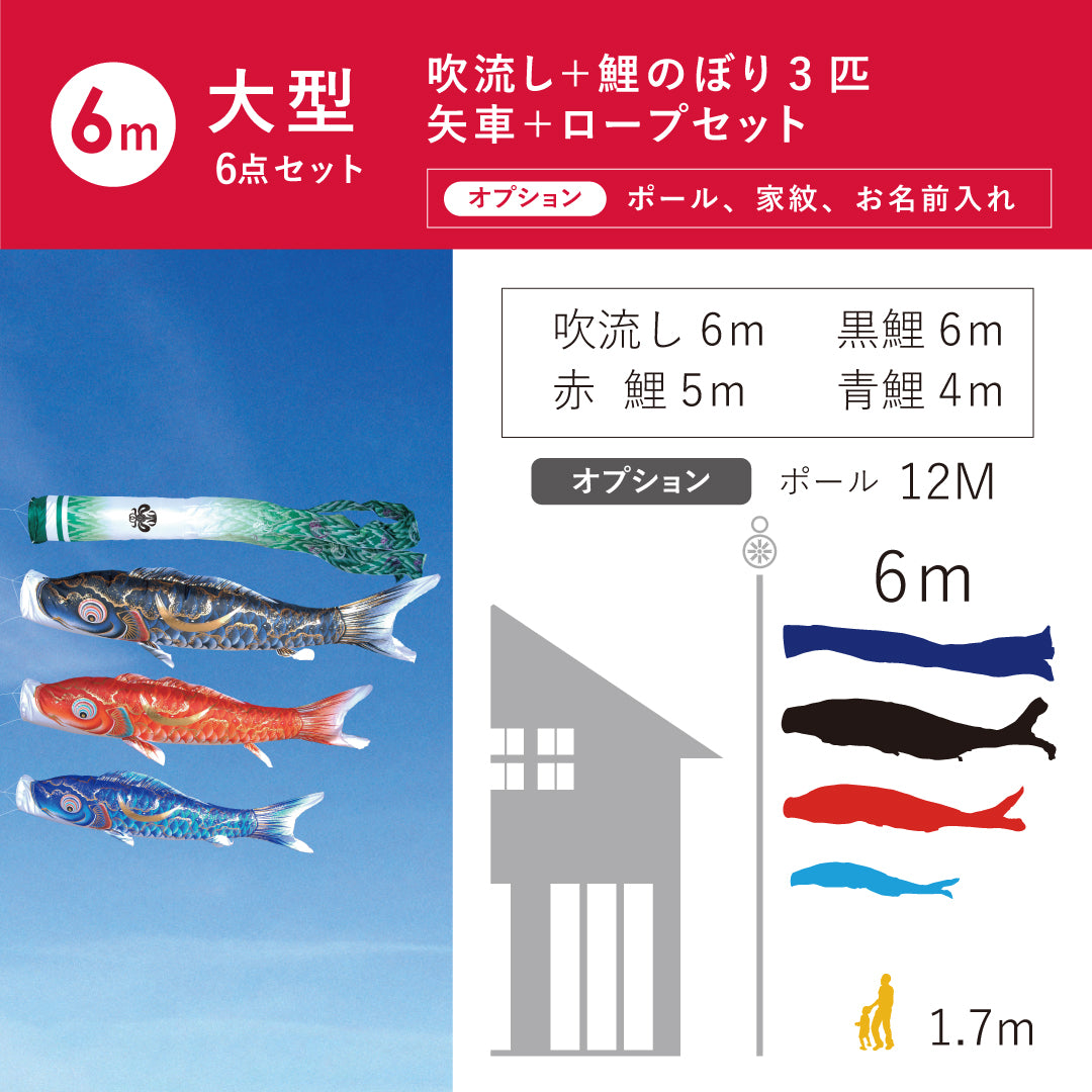 商品サイズ | ◆こいのぼりサイズ◆ 【6mセット】 吹き流し:6m 黒鯉:6m 赤鯉:5m 青鯉:4m 【5mセット】 吹き流し:5m 黒鯉:5m 赤鯉:4m 青鯉:3m ◆ポールの高さ◆ <6m鯉用>11.8m・7本継 <5m鯉用>10m・6本継 |