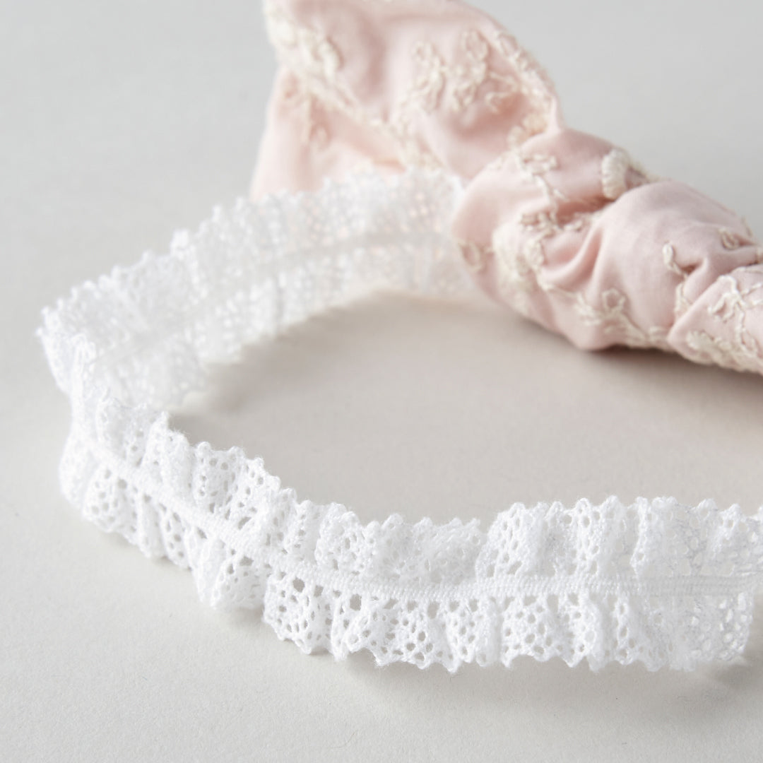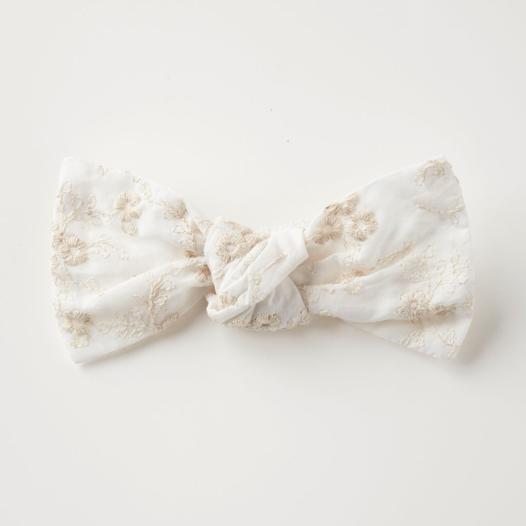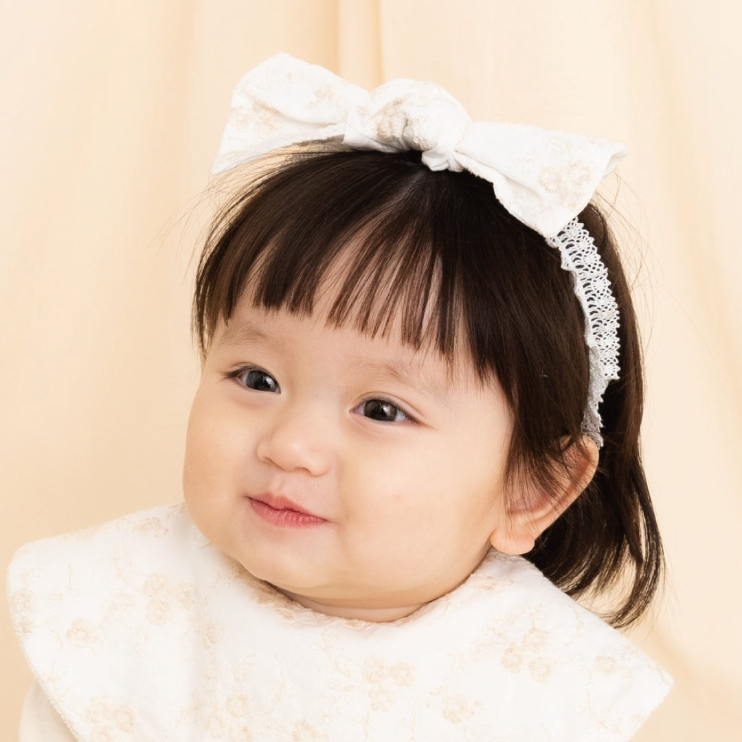 清楚なオフホワイトに、やさしい刺繍をほどこしたヘアバンドです。赤ちゃんのお顔を引き立てる大きめリボンがポイント。オフホワイトの刺繍生地は、やわらかな温もりのある雰囲気に仕上げています。