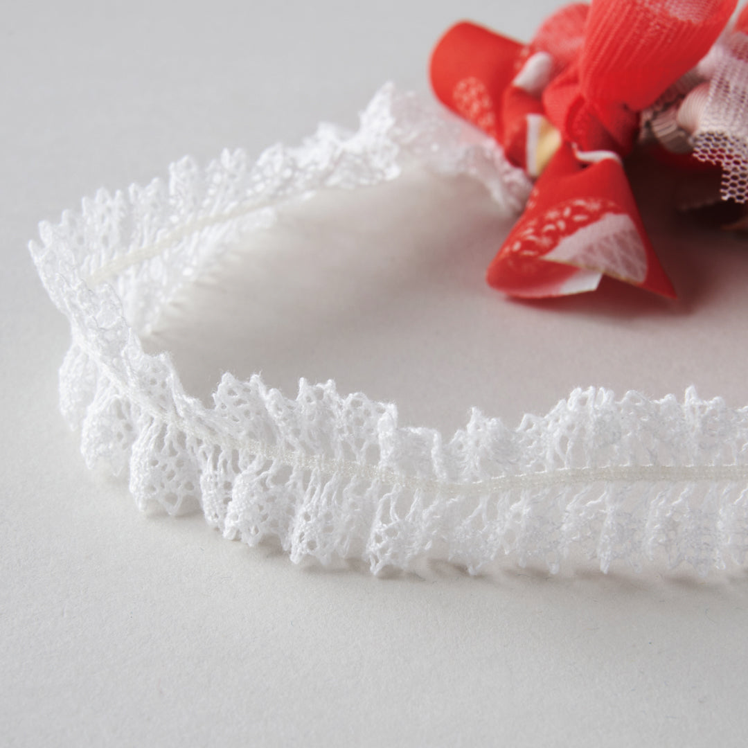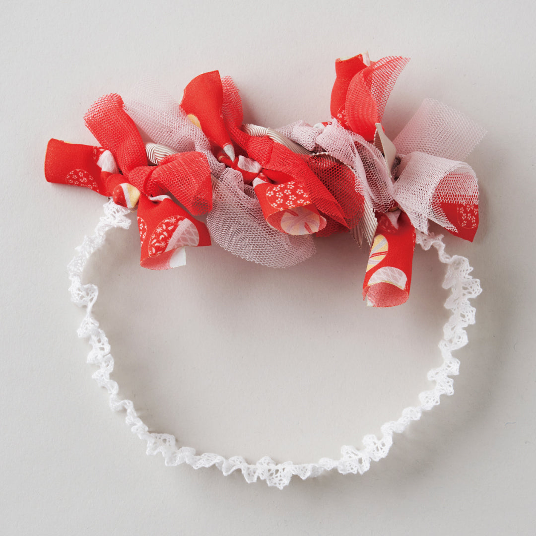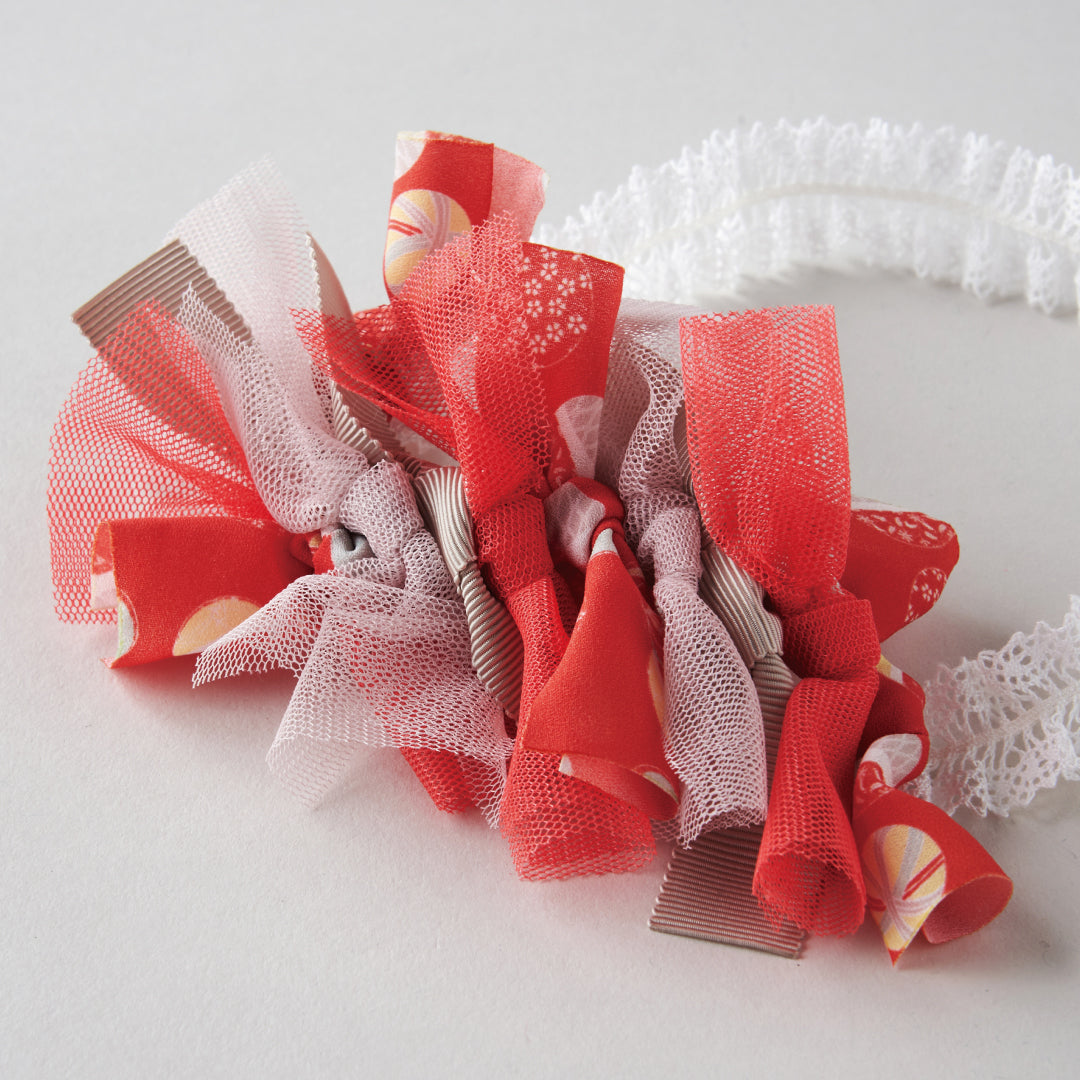 | 素材 | 手毬柄リボン:ポリエステル100% チュールリボン:ナイロン100% グログランリボン:ポリエステル100% レースゴム:コットン95%、ポリウレタン5% |