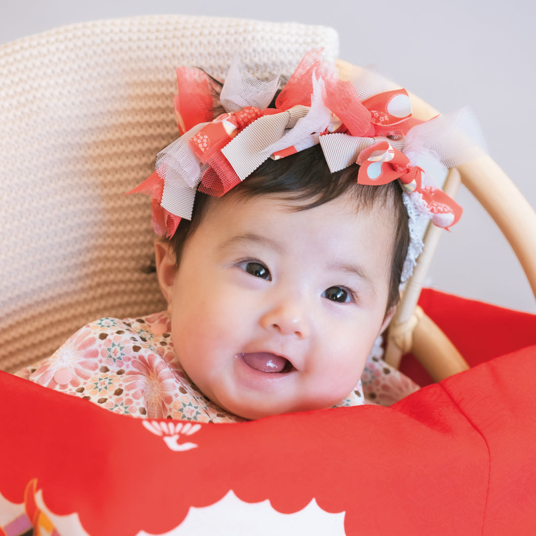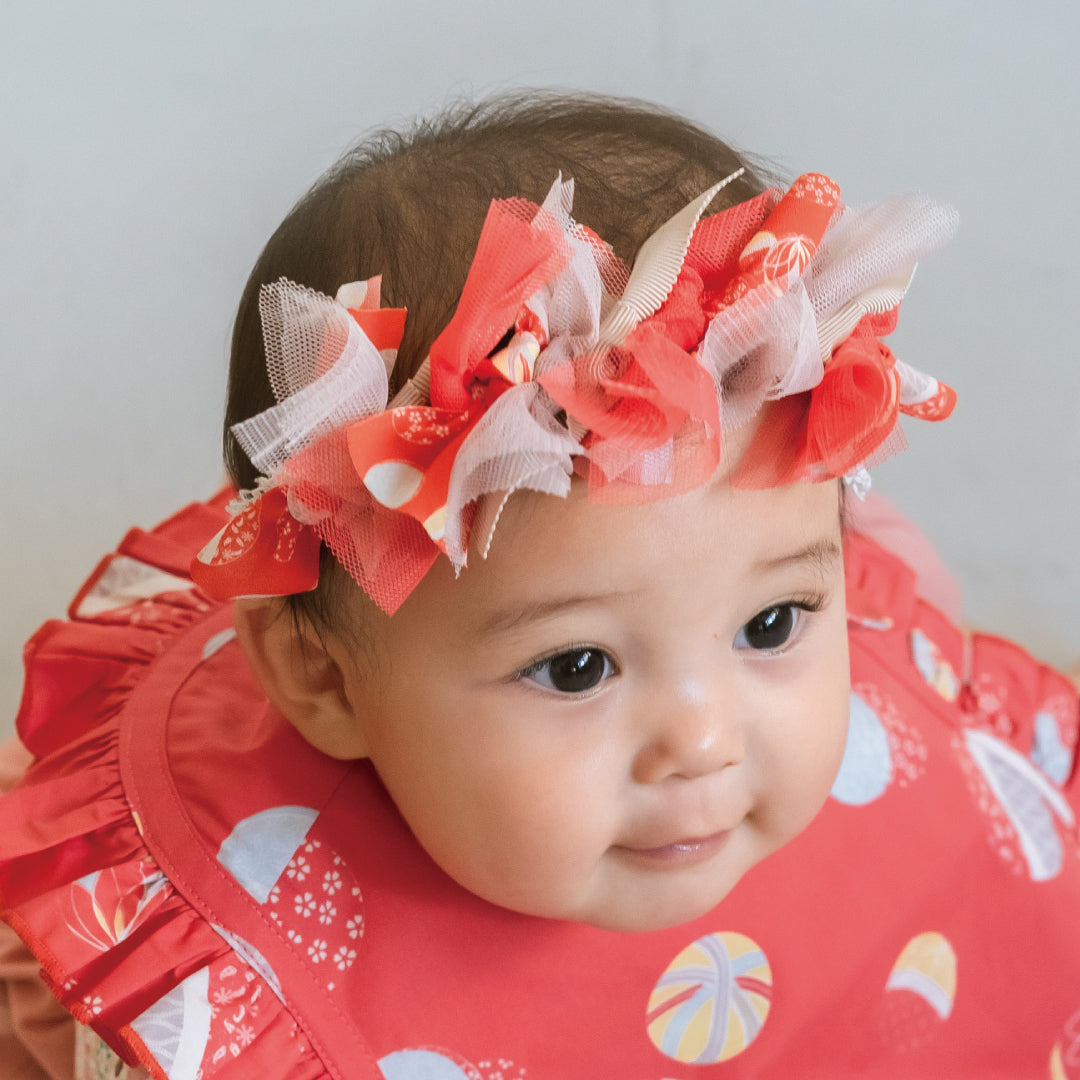 髪の量に関係なく着けられる、ベビー用カチューム。淡いチュールや和柄リボンをたっぷり重ねたボリューム感で、赤ちゃんの表情をより愛らしく引き立てます。袴ロンパースにはもちろん、普段のお洋服に合わせてもかわいい万能デザインです。