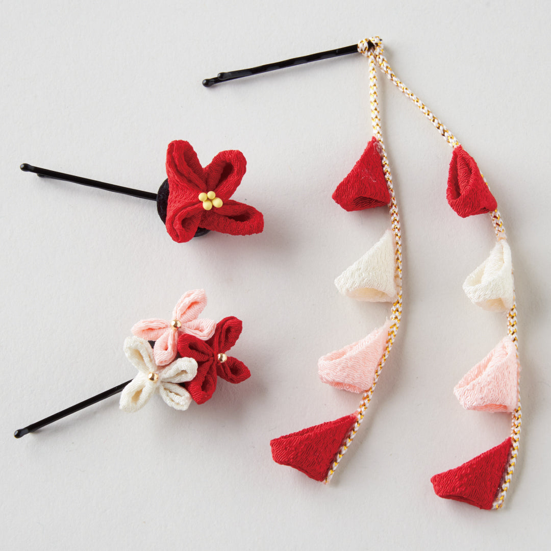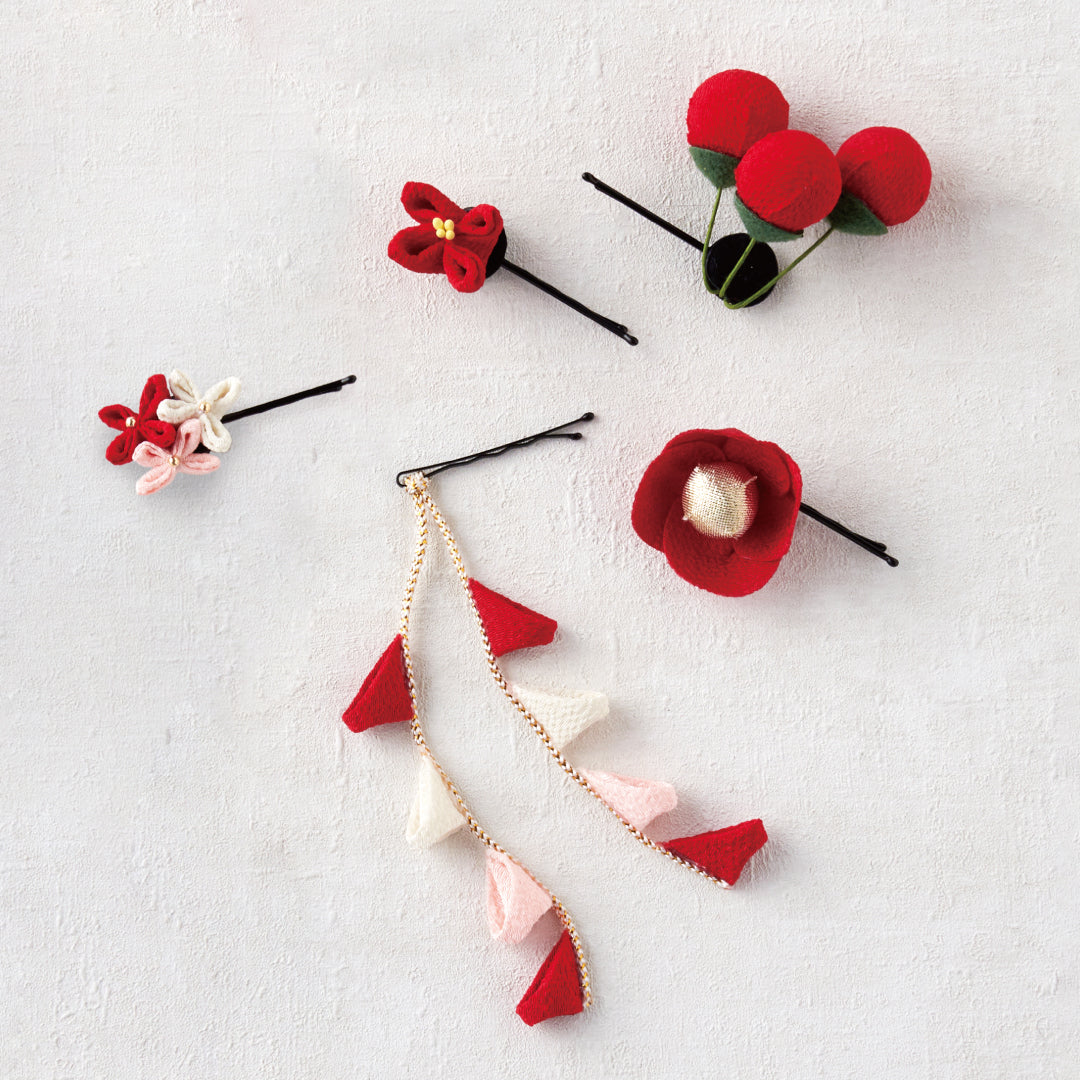 デザインの異なるつまみ細工モチーフが5本入った、華やかなアメピンセット。ダウンスタイルに“ぽんぽん”と散らすだけで、一気に和装らしい可憐な雰囲気が完成します。小さめサイズで軽く、アメピン仕様だからお子さまの髪にも使いやすいアイテムです。