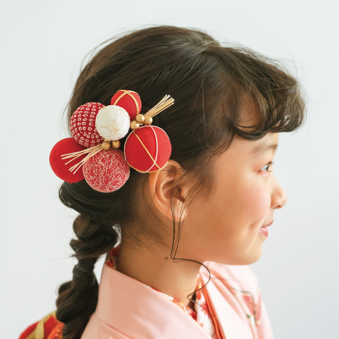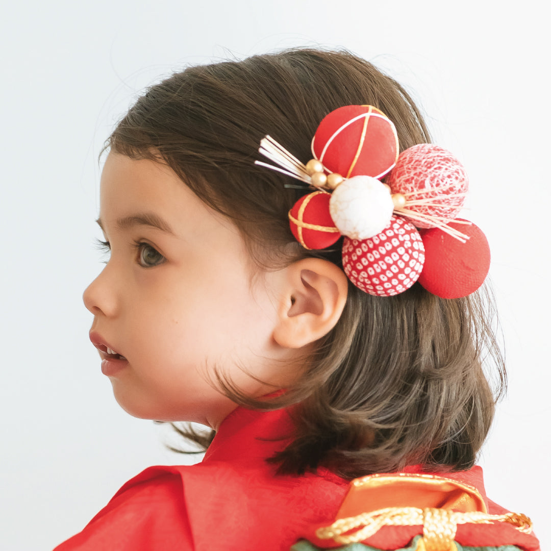 3歳頃から使えるサイズ感で、七五三はもちろん、お正月や記念日、イベントにも大活躍間違いなし。大人になっても長くお使いいただけるデザインです。流行に左右されない和柄手毬だからこそ、成長とともに思い出を重ねられる髪飾りとして人気。大切な方への贈り物にもおすすめです。
