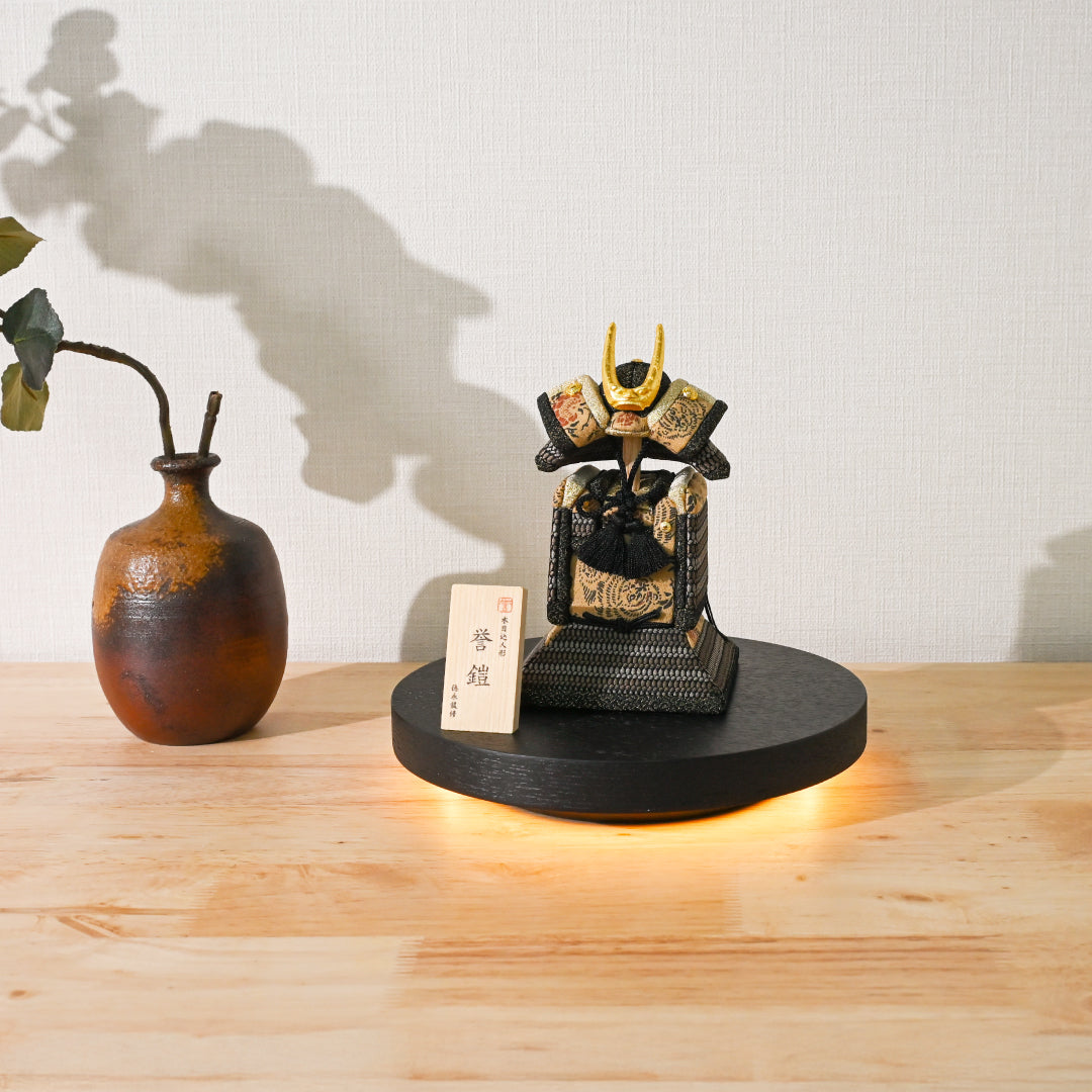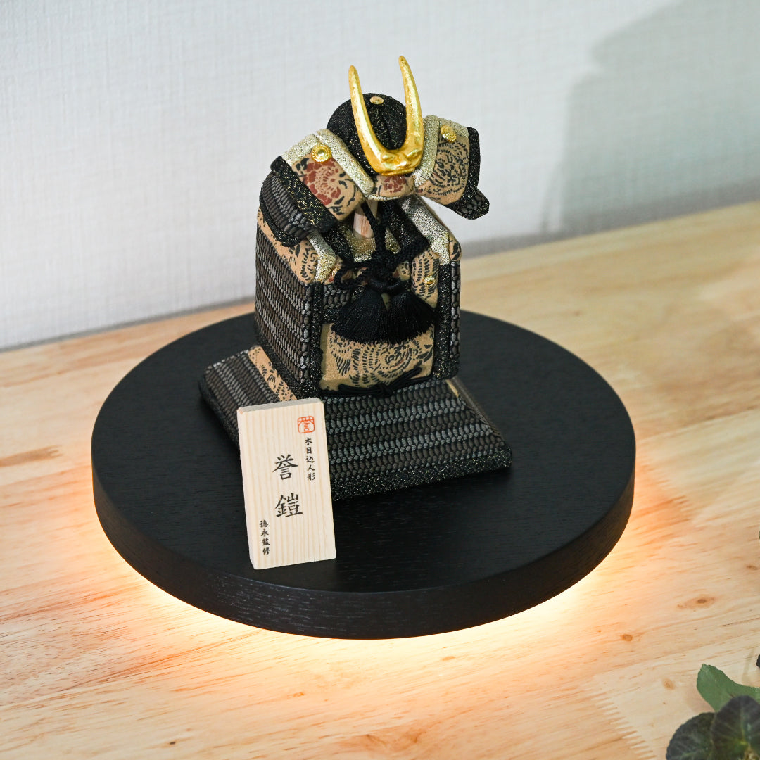 台座下部から、優しい光が広がり、鎧の陰影や立体感を美しく楽しめます。