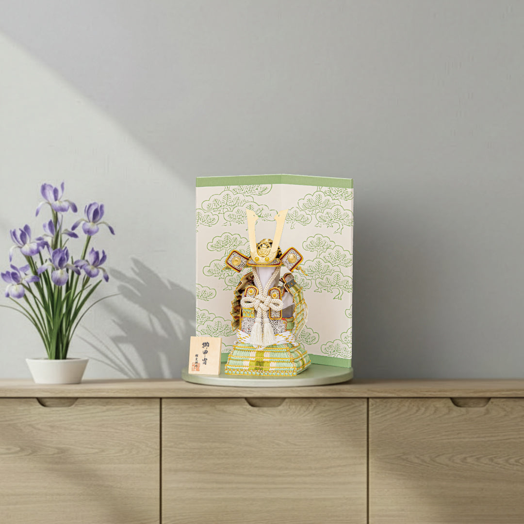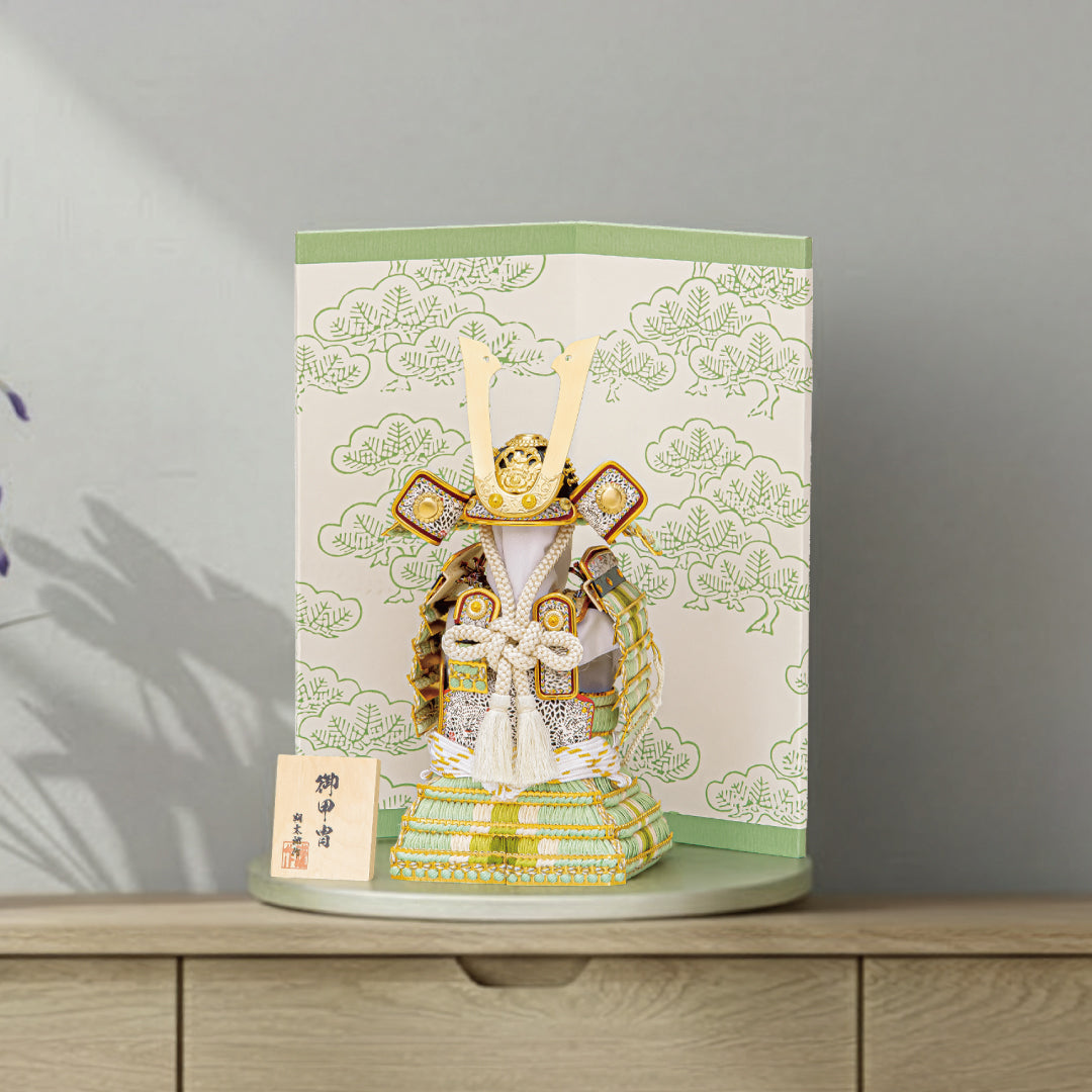 翠の鎧と松文様の屏風が重なり合い、こどもの健やかな成長を末永く見守る節句飾りとなっています。