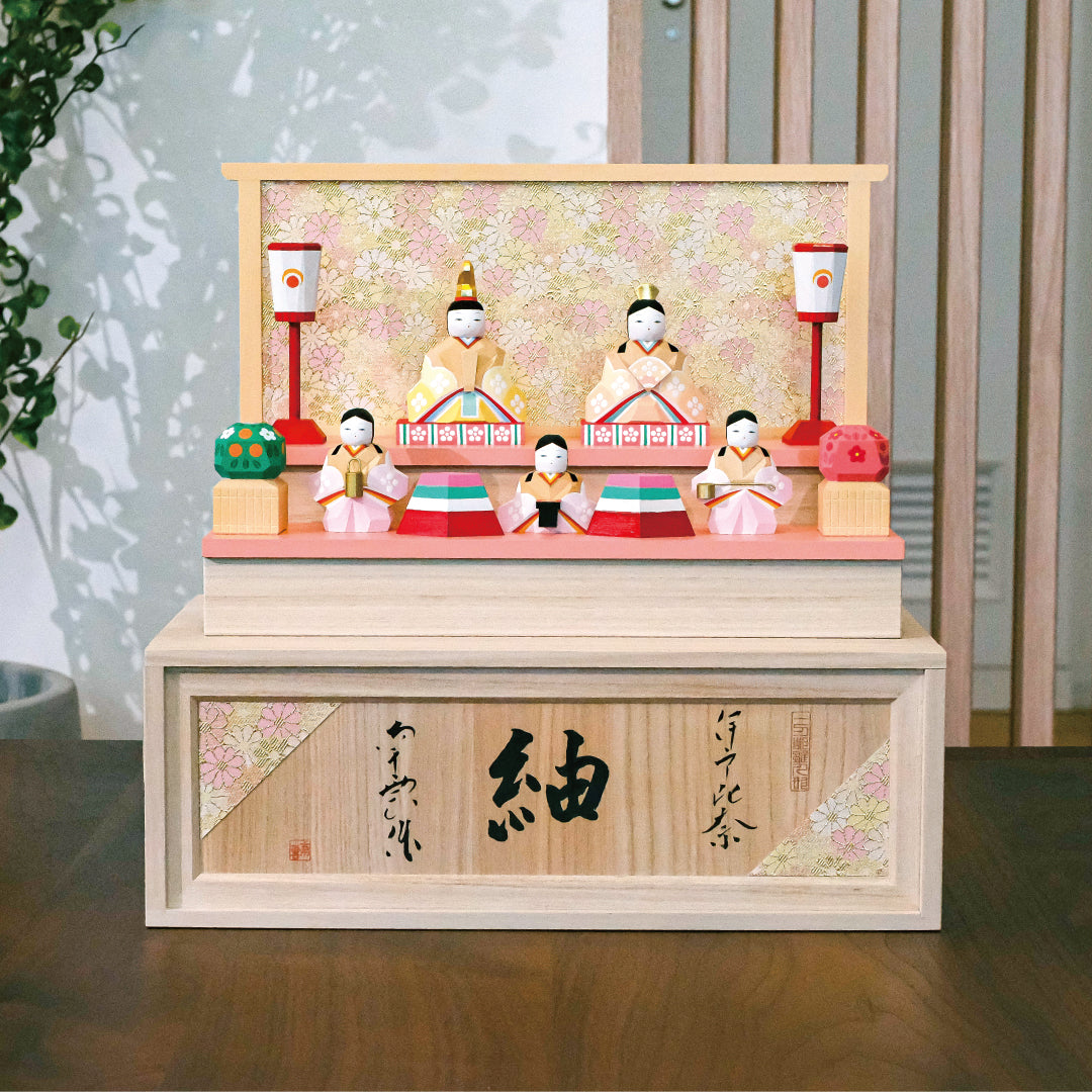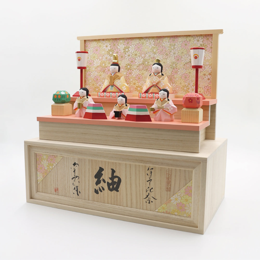 「紬 五人飾り」は、飾り台がそのまま収納箱になる設計です。
