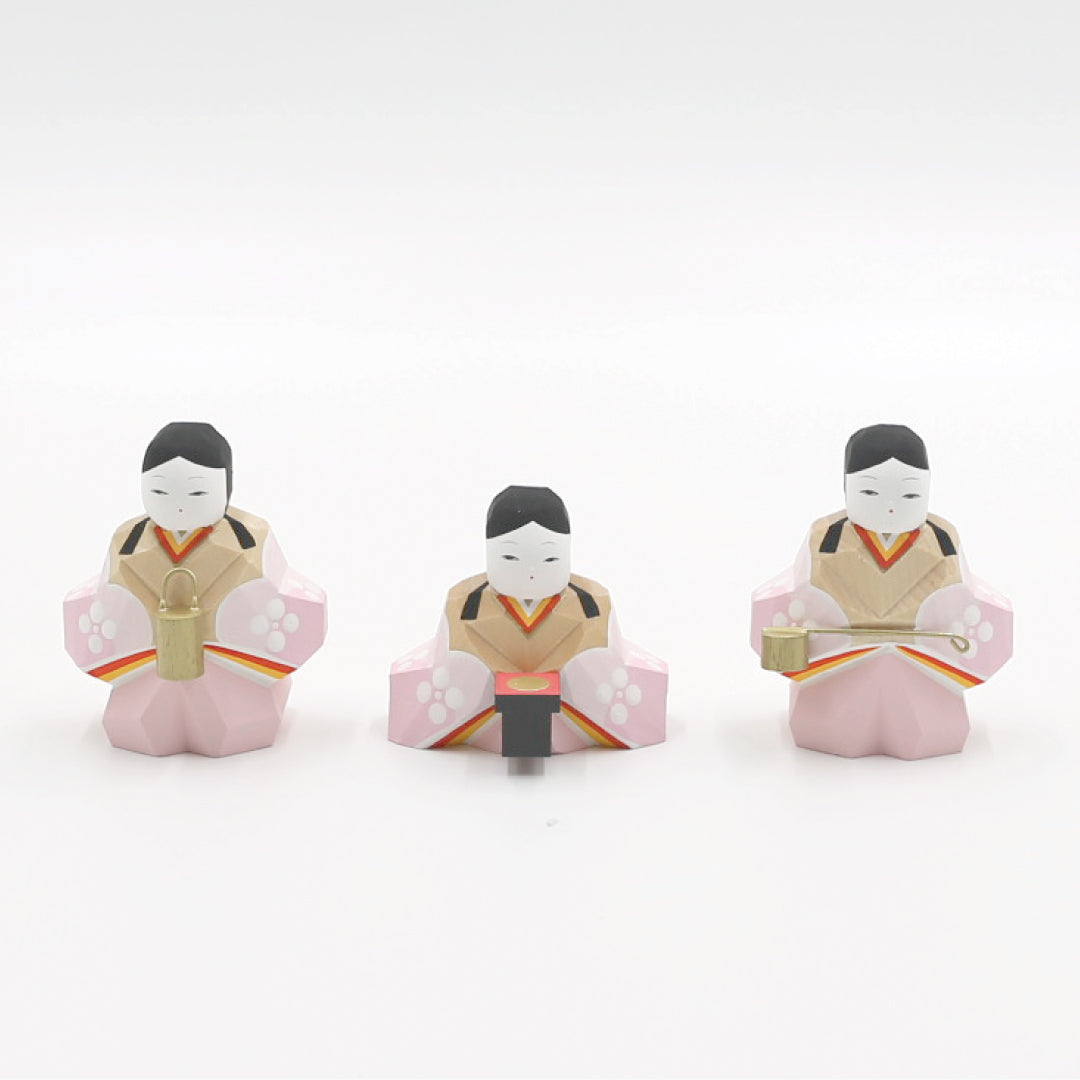 この雛人形は熟練した職人の手で一体ずつ制作されます。木材を選び、荒彫り → 細部仕上げ → 彩色と進む工程は全て手作業。顔や衣装の色づかいは、木の温かさを損なわないやさしい色調で仕上げられ、ほっとするような空気感を感じられます。