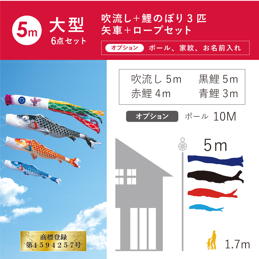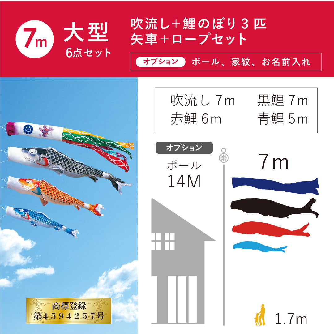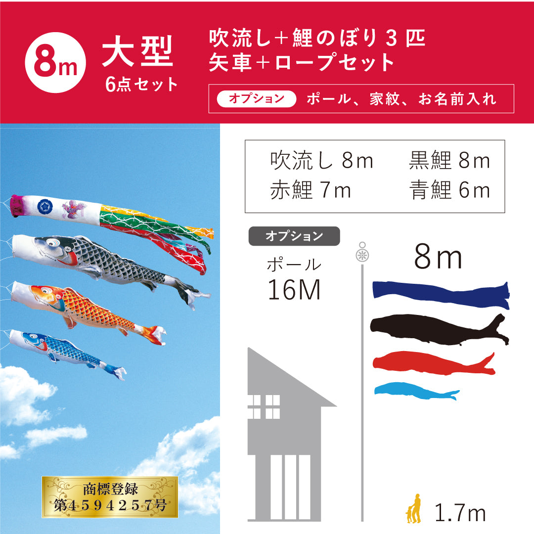 商品サイズ | 【8mセット】 吹き流し:8m 黒鯉:8m 赤鯉:7m 青鯉:6m 【7mセット】 吹き流し:7m 黒鯉:7m 赤鯉:6m 青鯉:5m 【6mセット】 吹き流し:6m 黒鯉:6m 赤鯉:5m 青鯉:4m 【5mセット】 吹き流し:5m 黒鯉:5m 赤鯉:4m 青鯉:3m ◆ポールの高さ◆ <8m鯉用>16m(15.30m)・9本継 <7m鯉用>14m(13.85m)・8本継 <6m鯉用>11.8m・7本継 <5m鯉用>10m・6本継 |
