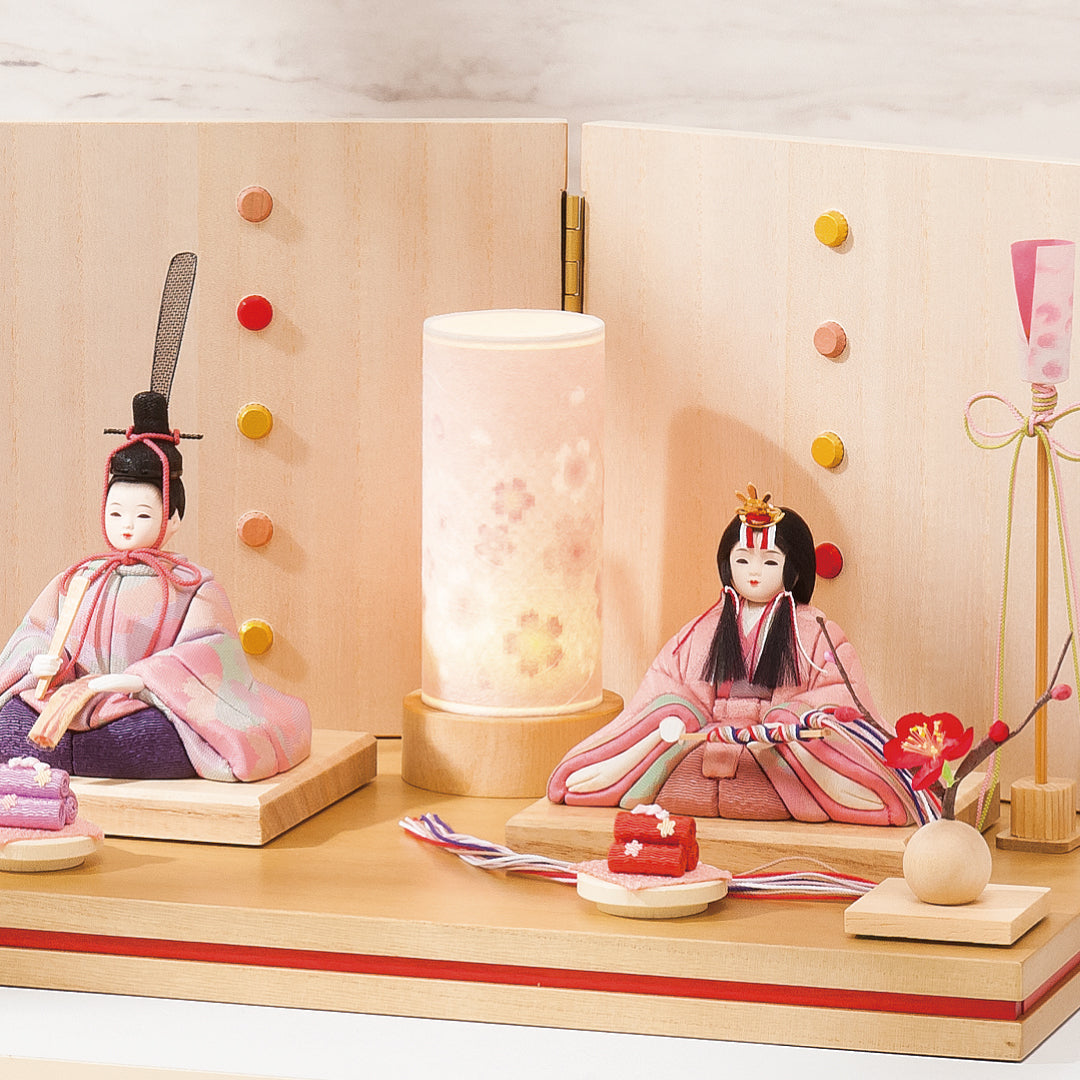 左右にはすっきりとした燭台と紅白梅を配し、中央にはやわらかな光を灯すLEDライトを設えました。穏やかな灯りに包まれた親王飾りが、あたたかく心和むひな祭りのひとときを演出します。