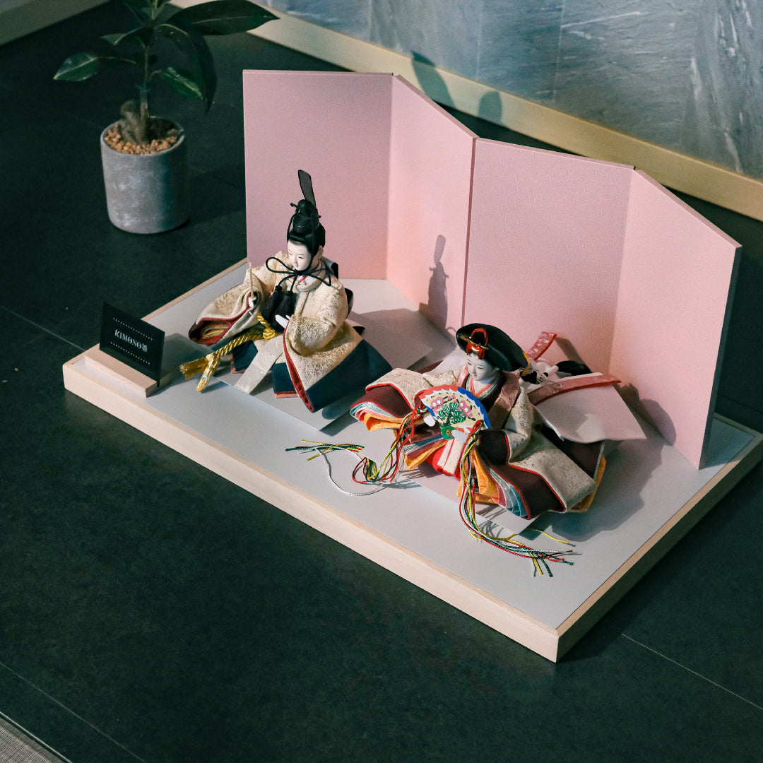 どんなお部屋にもお洒落に飾っていただけるよう、一見派手に見えるKIMONO雛ですが、ワイド幅の屏風と台座を仕様にし、余白によってインテリア性を高め、コンパクト雛ながら余裕のある飾り心地にしています。にっぽんのお飾りだからこそ、侘び寂びの美的感性に忠実に設計しています。