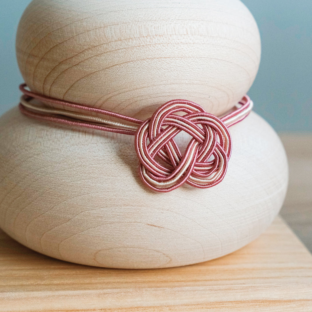 中央には、美しいあわじ結びの水引飾りを添えました。長く続くご縁や平穏を願う意味を持ち、新年のお祝いにぴったり。木と水引の組み合わせが、優雅で凛とした佇まいを生み出します。