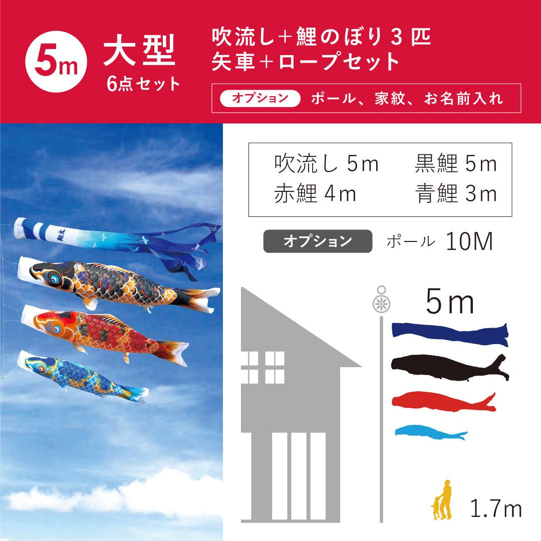 商品サイズ | ◆こいのぼりサイズ◆ 【6mセット】 吹き流し:6m 黒鯉:6m 赤鯉:5m 青鯉:4m 【5mセット】 吹き流し:5m 黒鯉:5m 赤鯉:4m 青鯉:3m |