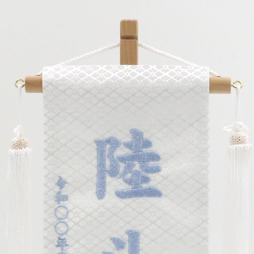 | 素材 | 商品名:金襴刺繍名前旗〈白兜〉 生地:金襴織物 刺繍:金糸刺繍(お名前・生年月日) 付属:木製飾り台 生産:日本製 |