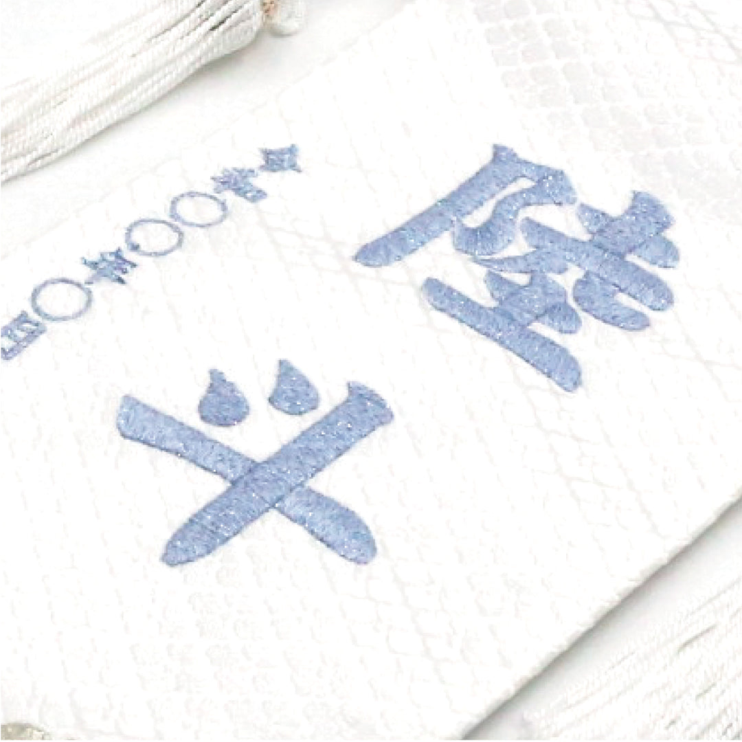 薄い青色の刺繍糸で丁寧にお入れいたします。