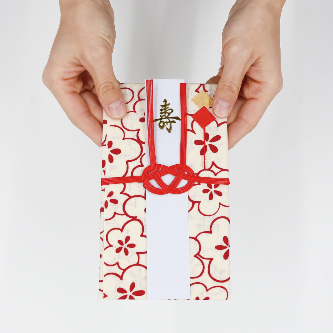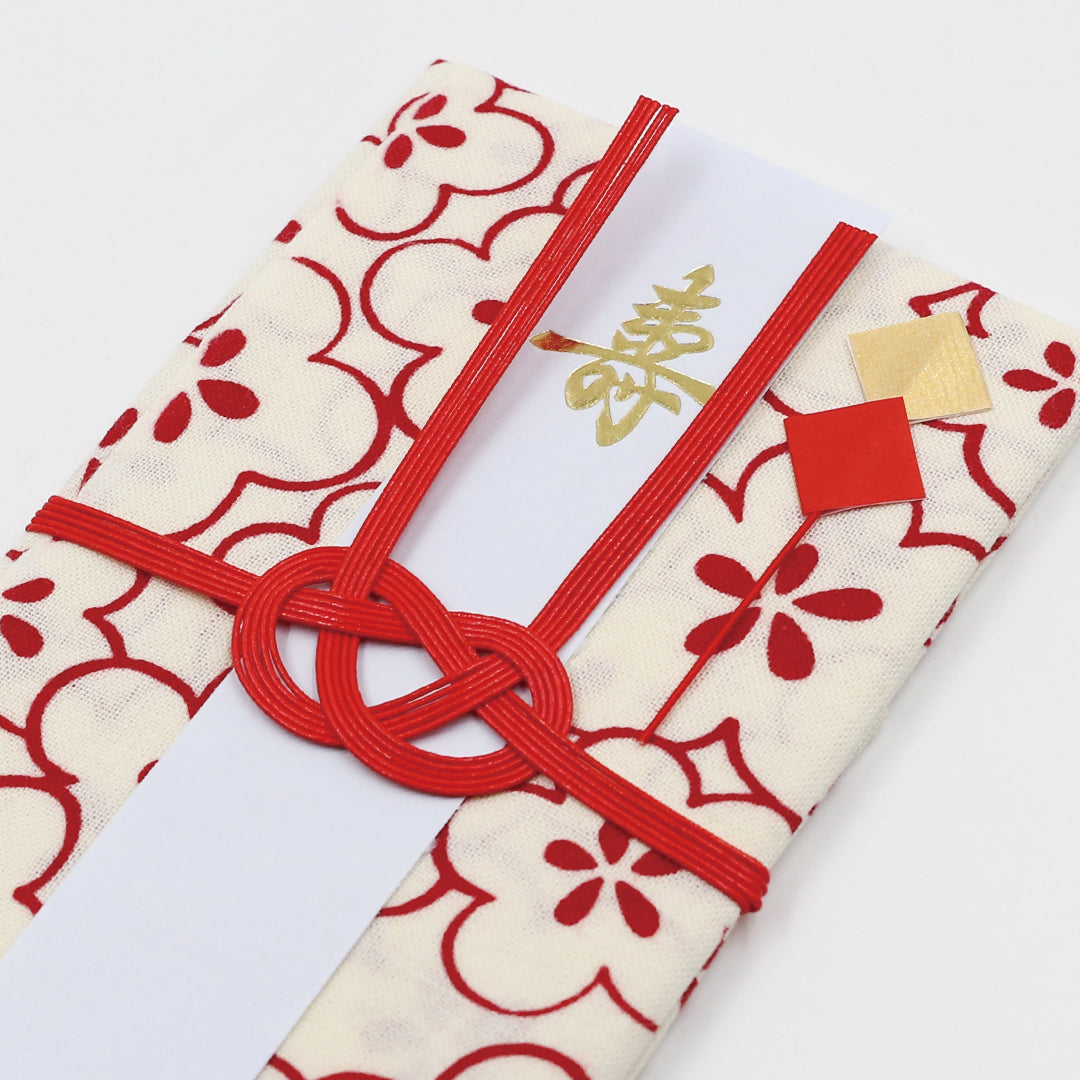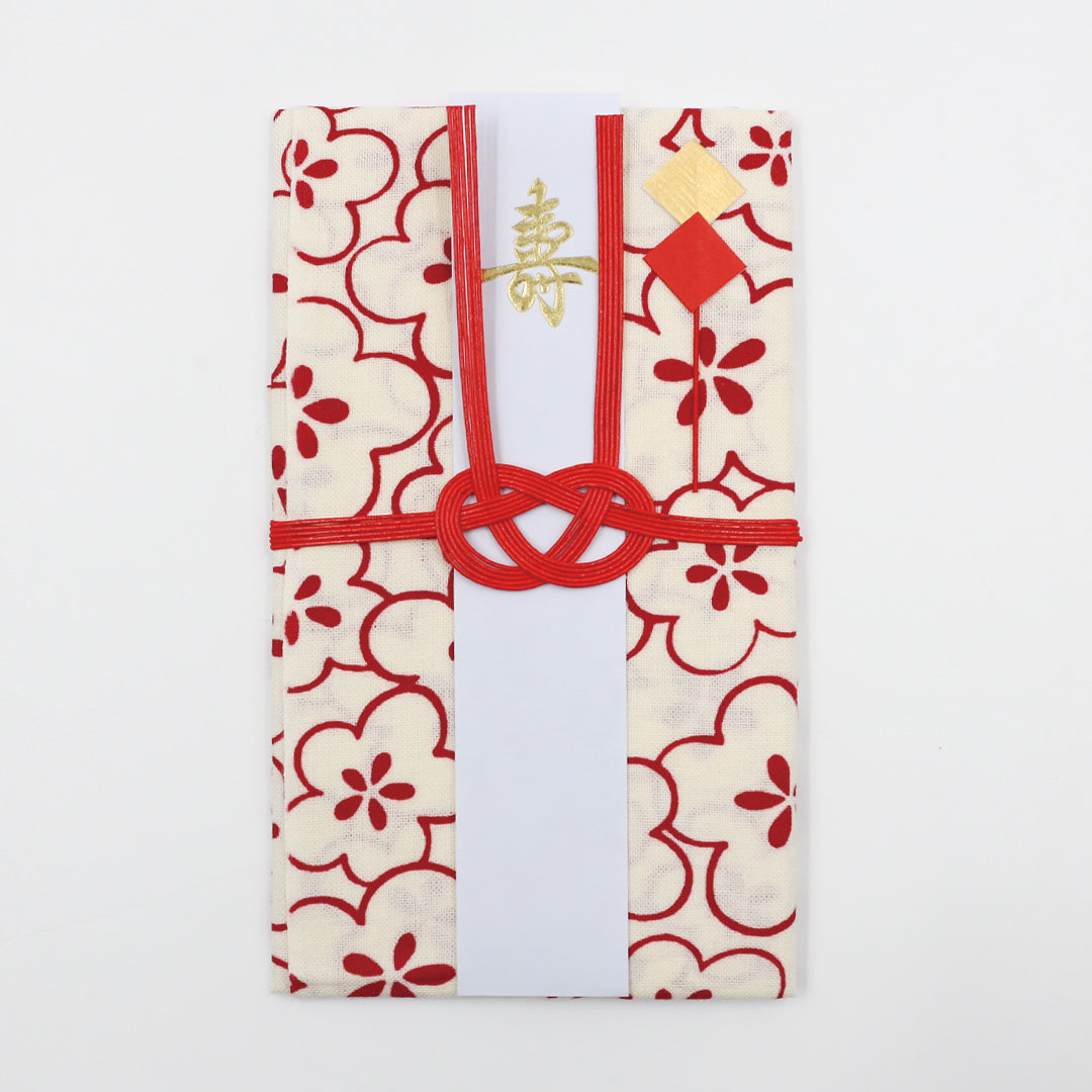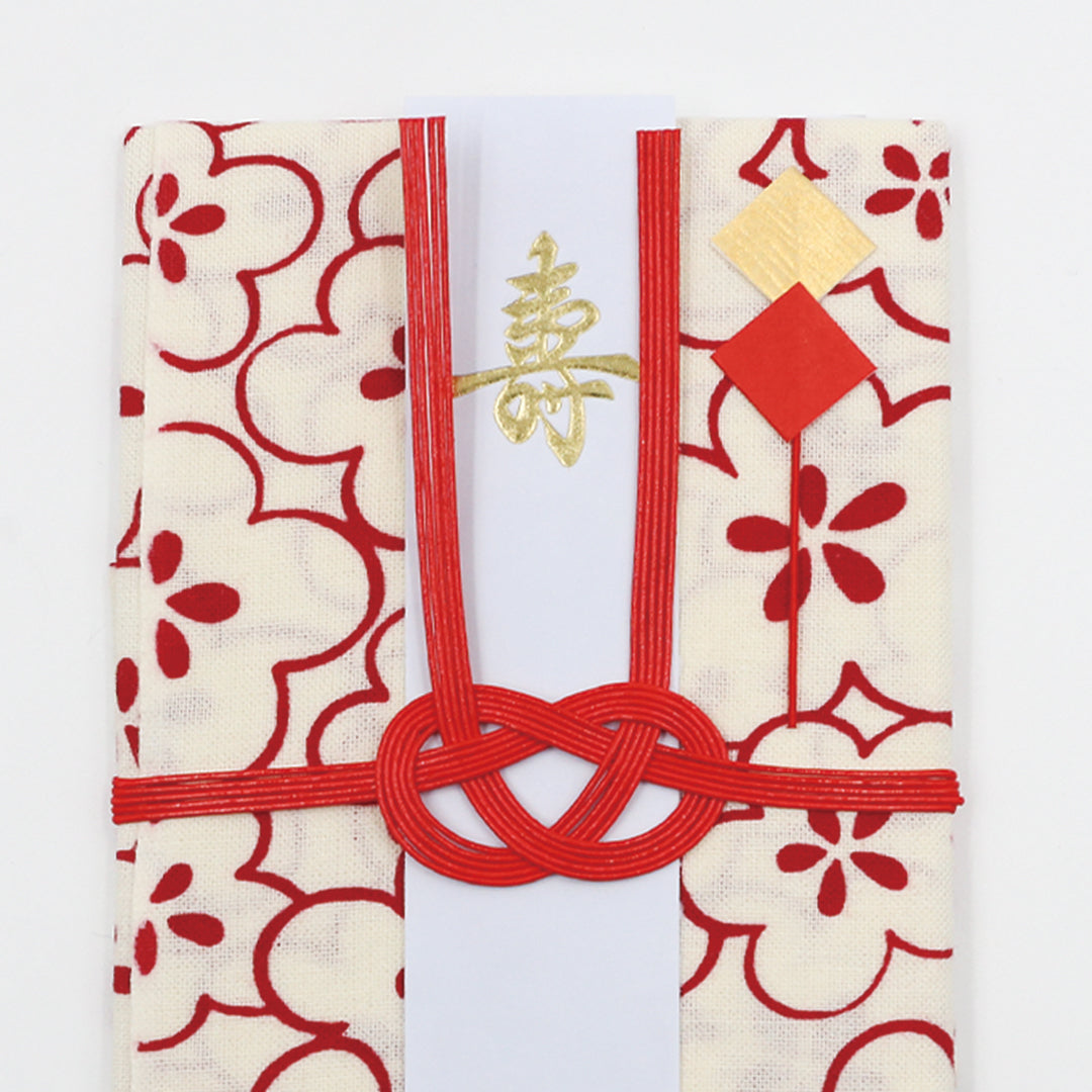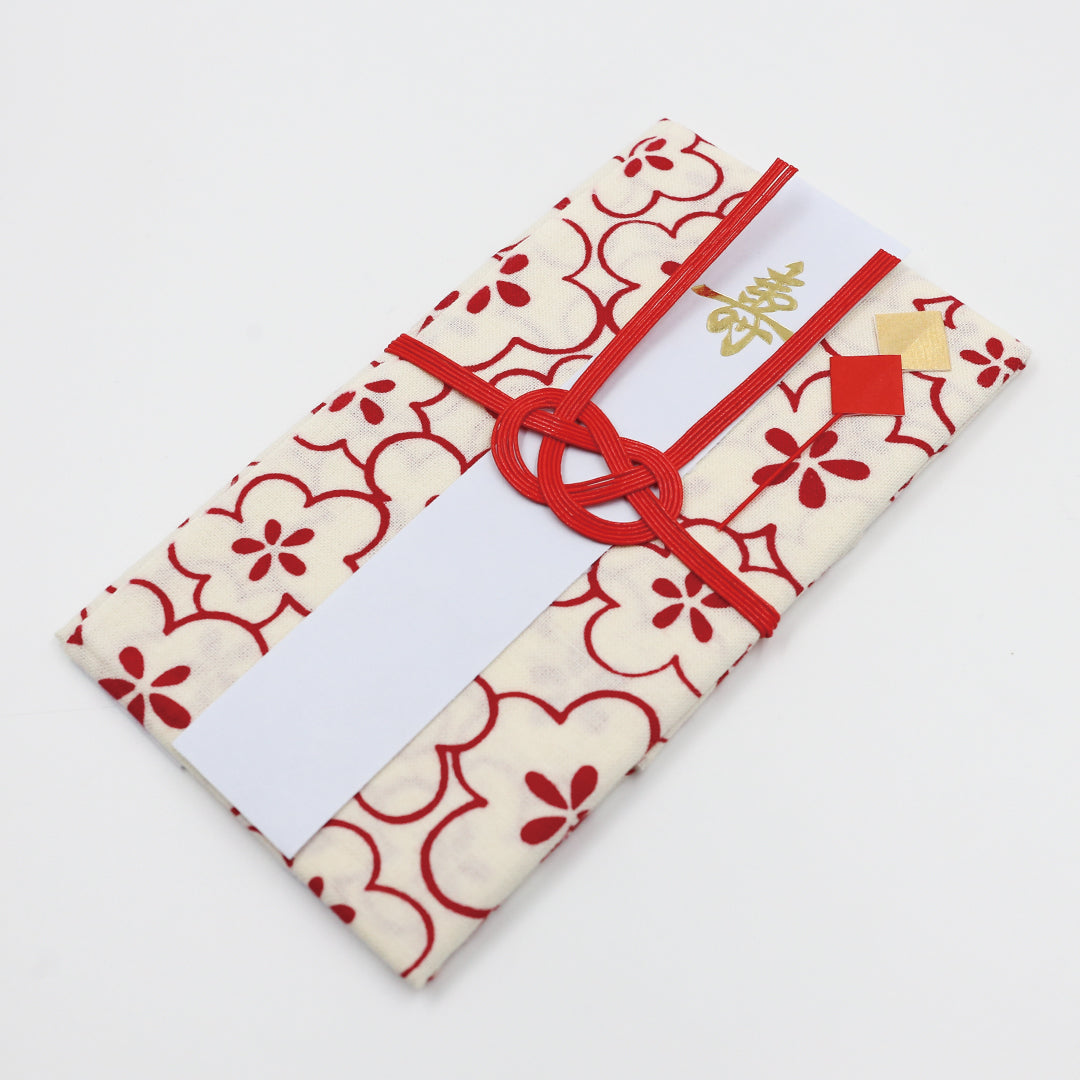 ふんわりとした綿布に、赤く愛らしい「梅花丸」を染め上げた祝儀袋。