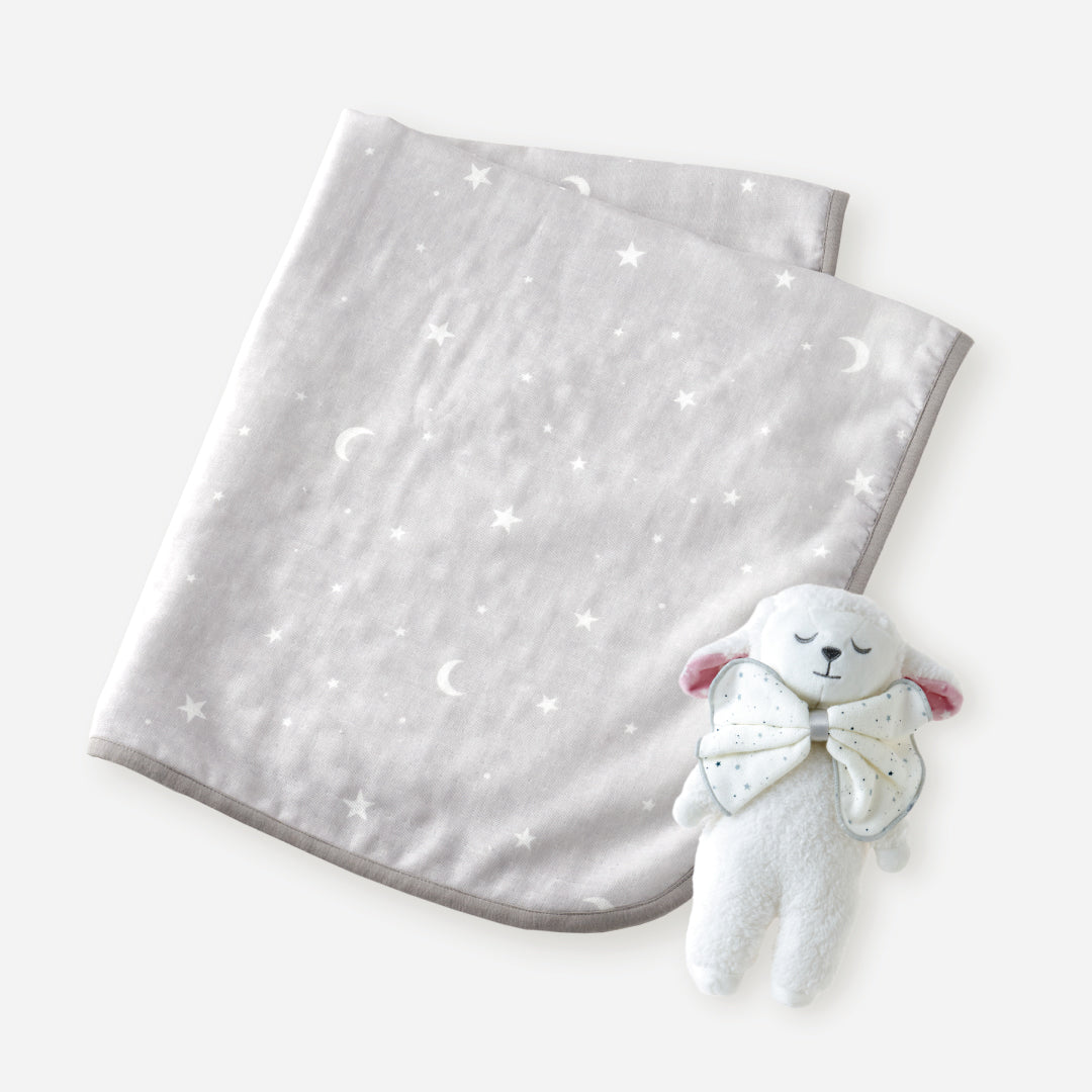 星柄ブランケット・ひつじのぬいぐるみ・ハンカチが揃ったスペシャルセット。赤ちゃんのお昼寝やおでかけを、そっと心地よく支えてくれます。出産祝いやお誕生日祝いにもよろこばれます。