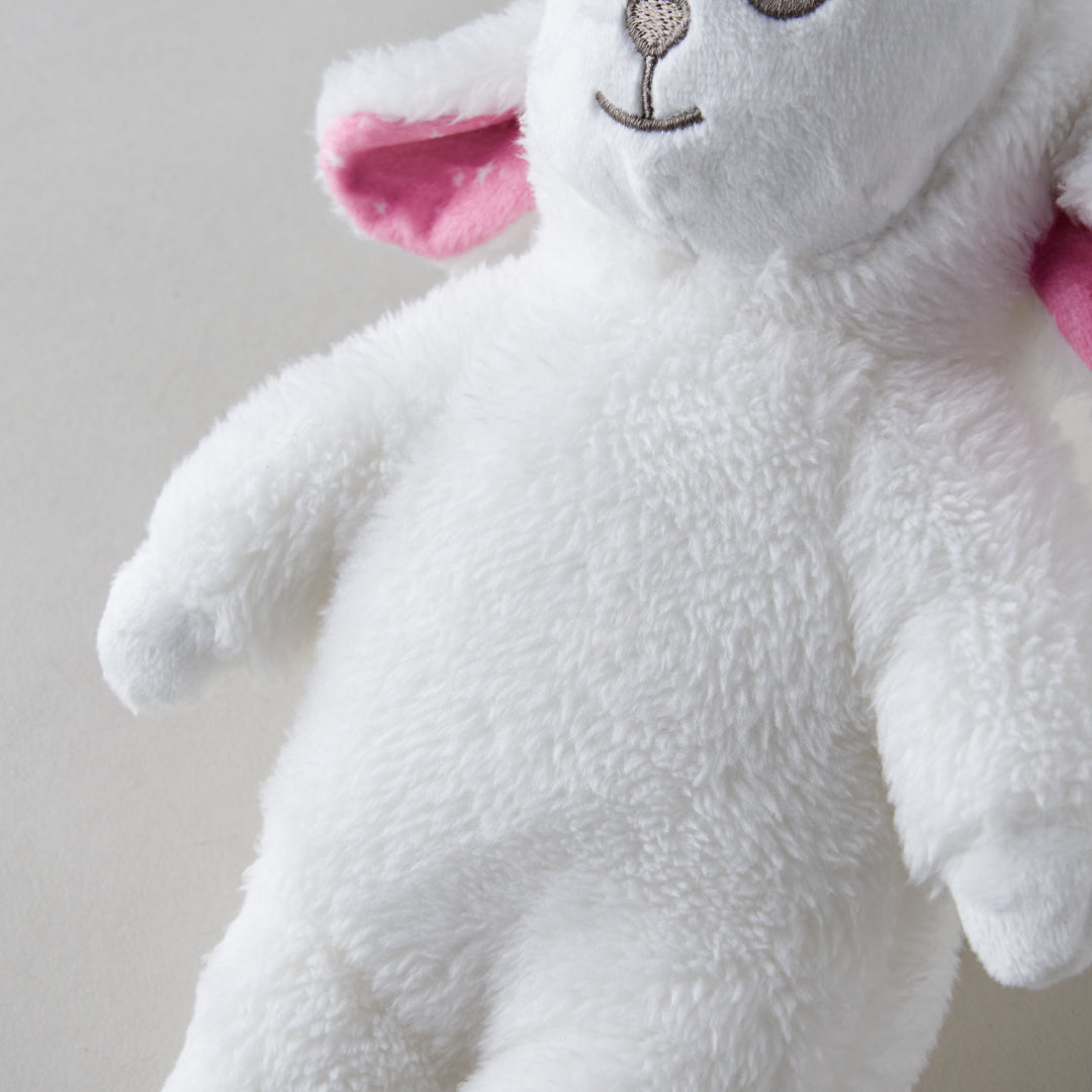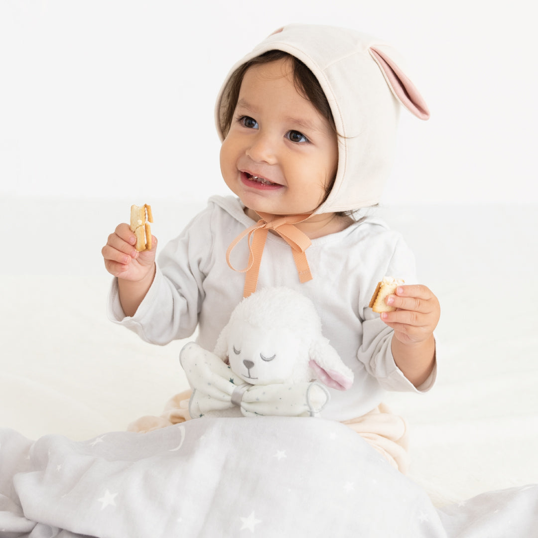 眠たそうな表情が愛らしい、ひつじのぬいぐるみ。赤ちゃんの手に収まりやすいサイズで、ぎゅっと抱きしめやすく、“はじめてのお友だち(ファーストトイ)”としてもぴったりです。