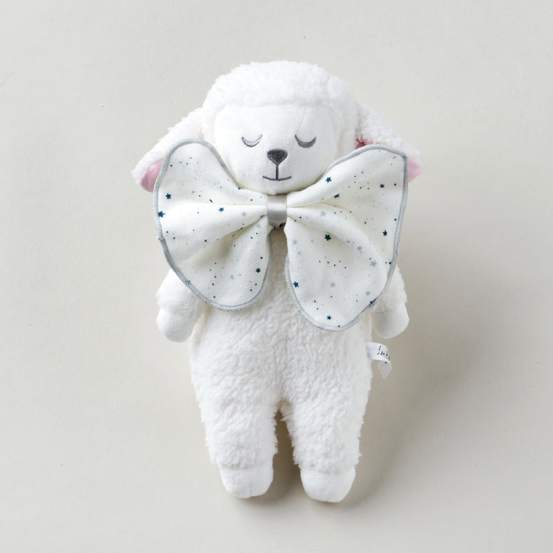 ひつじのぬいぐるみの蝶ネクタイは、取り外してハンカチとしてお使いいただけます。保育園でも使いやすいサイズ感で、汗拭きやよだれ対策、お出かけ時のちょっとしたお世話にも大活躍。同じ星柄で統一感があり、セットで持つとさらにかわいらしさがアップします。