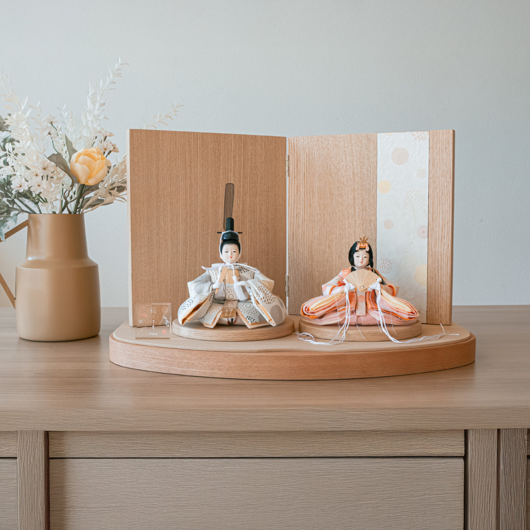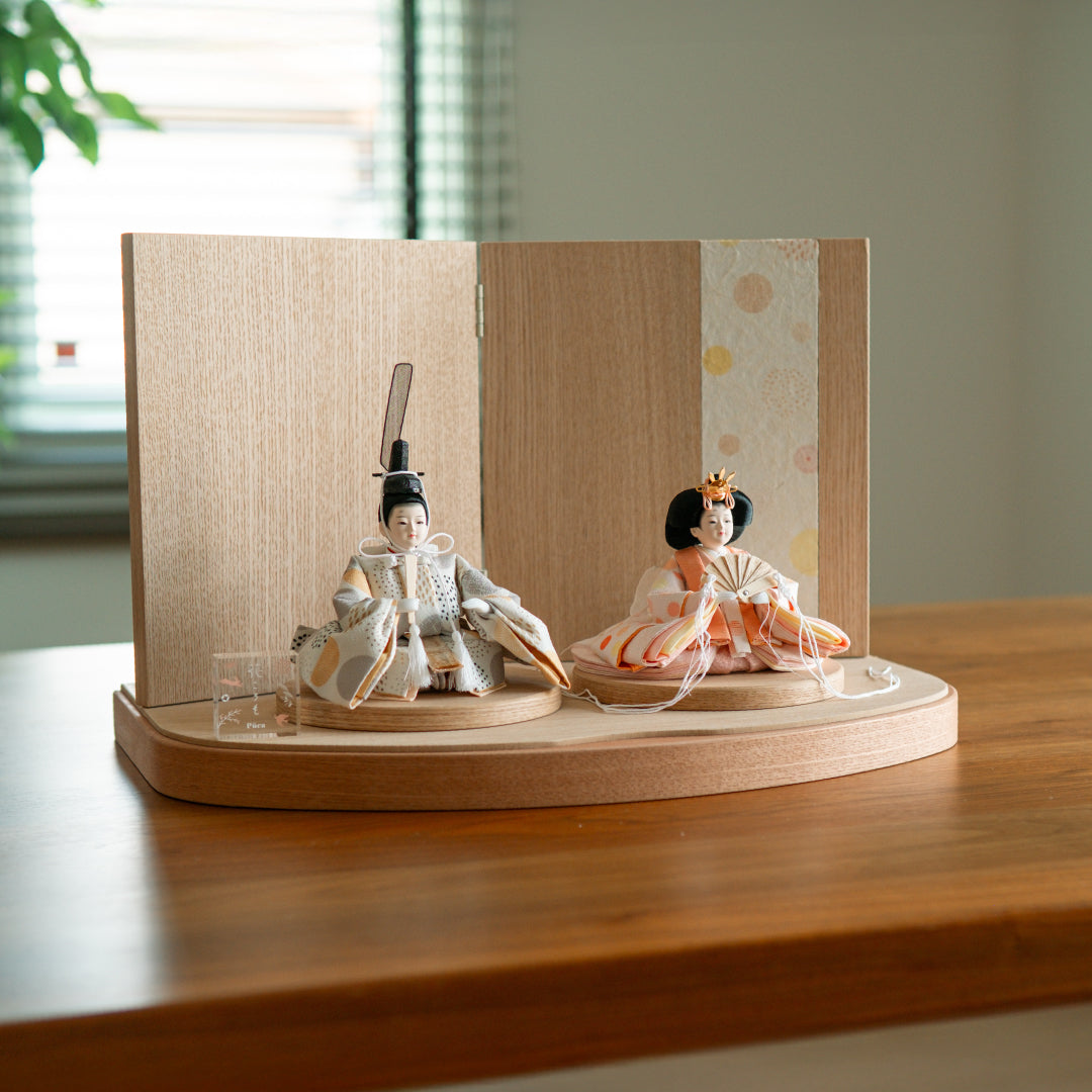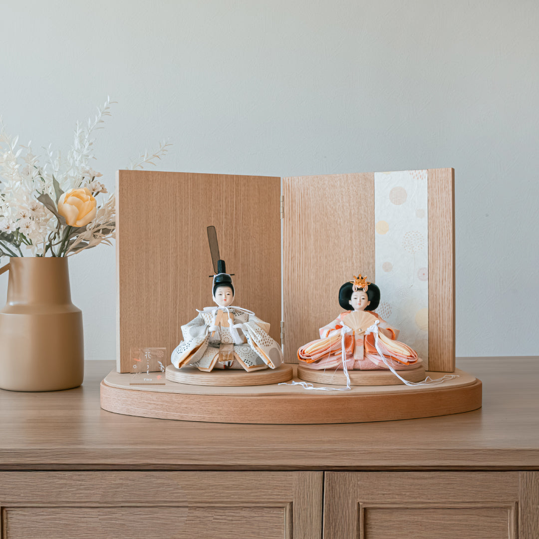 ぬくもりある木製台座に、シンプルな二曲屏風の縦長デザインはコンパクトながらゆとりを持たせ、可愛らしいお雛様の姿が引き立ます。