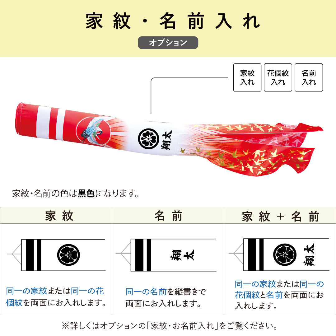 家紋・花個紋・お名前入れをご希望の際は、鯉のぼりのセットと同時にオプションのお名前入れをご購入ください。