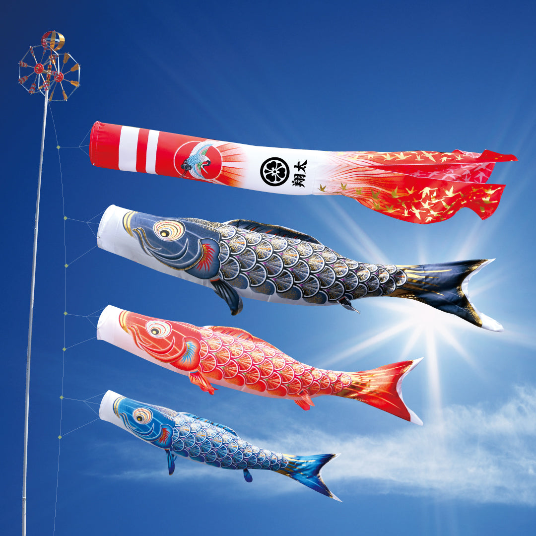 偉大なる太陽をテーマにした黄金の輝き鯉と、縁起の良い日之出鶴柄を配した吹流し。