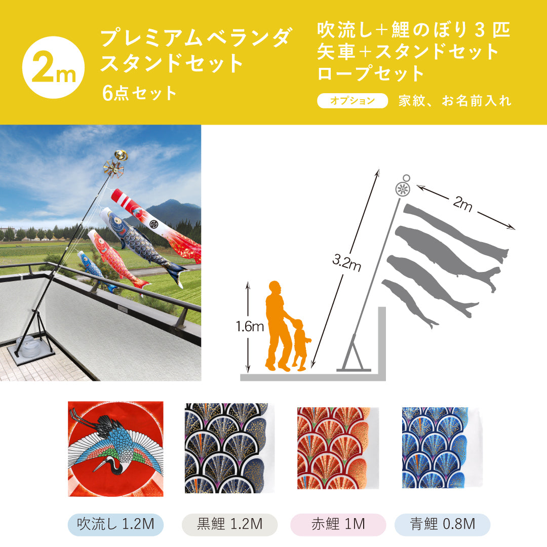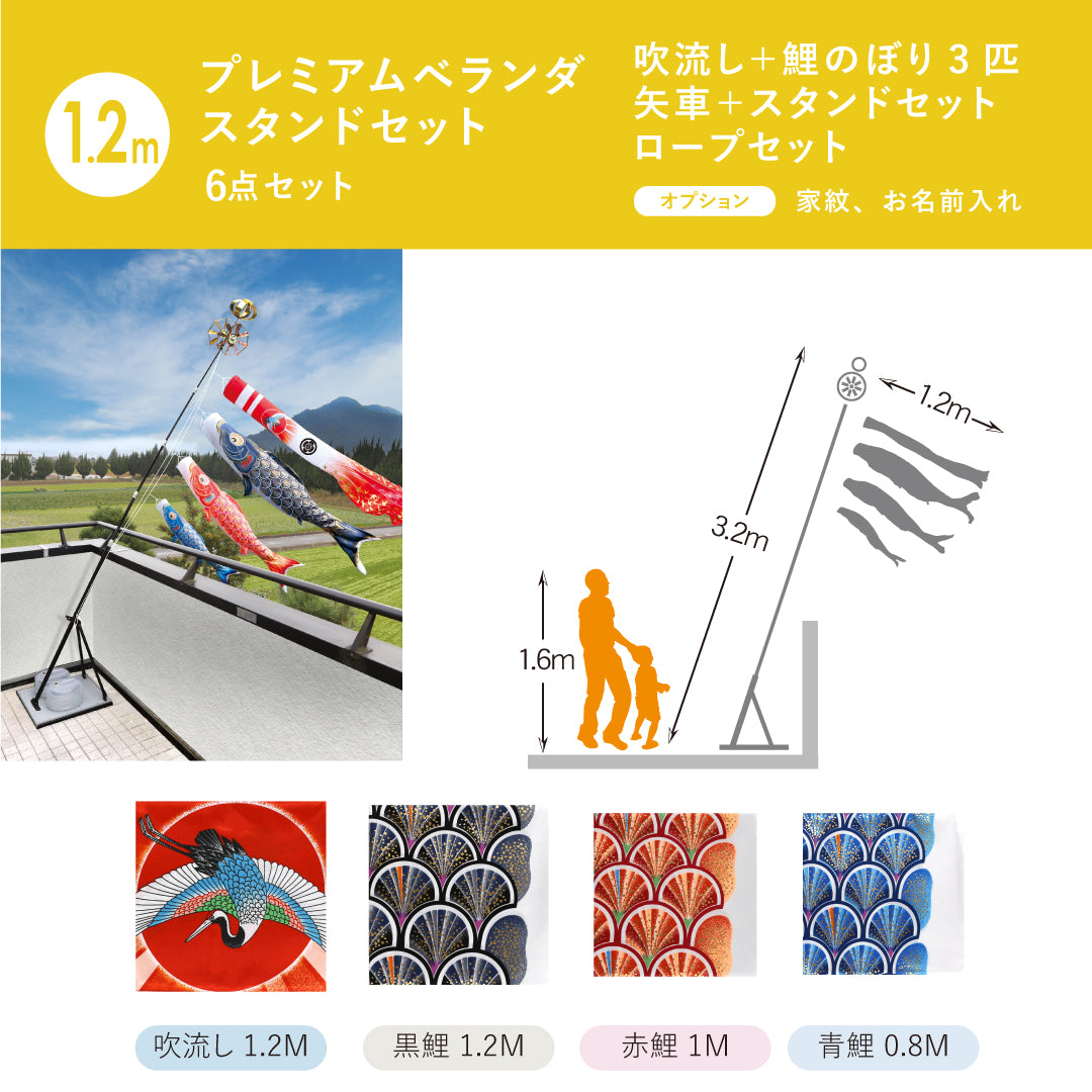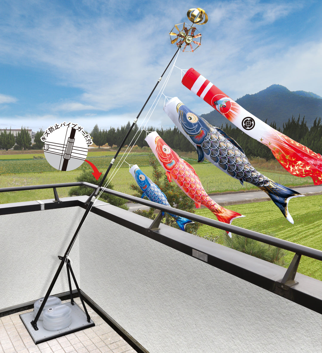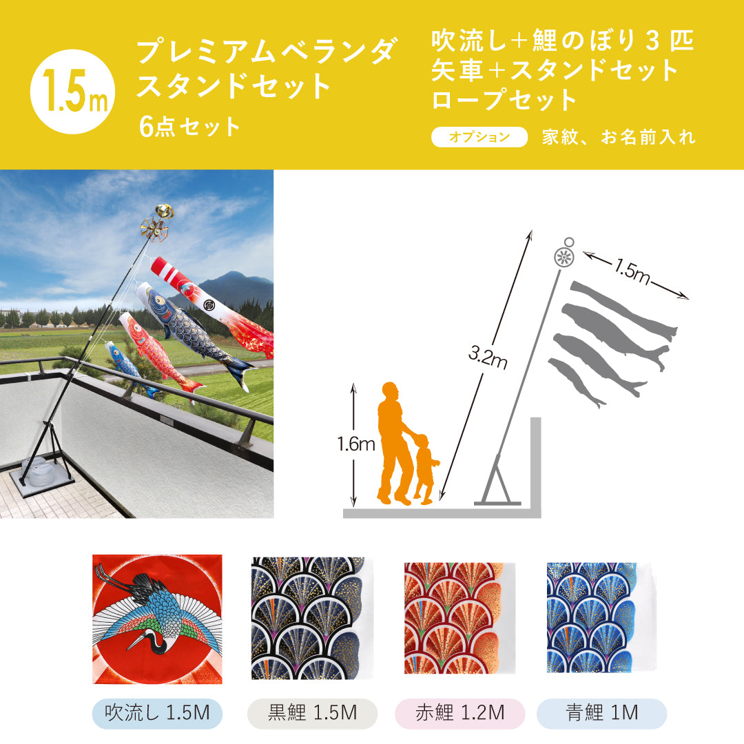 ベランダに適したスタンドタイプのセットです。小型セットでも矢車・ロープ・ポール等、大型セット並に本格派で、すべての部品が整っています。こいのぼりを水袋のおもりで支えるタイプで、取付金具のように一定の場所に固定する必要がなく移動も楽々。