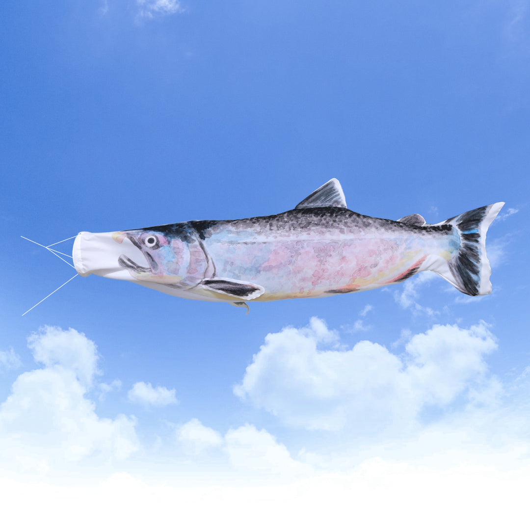 遡る鮭のたくましさと、秋の海を感じさせる銀色の輝きを立体的に再現。 イラストレーター・カドワキタミが描き、上品でありながらどこかユーモラスで愛らしい表情を元に仕上げました。 空を悠々と泳ぐ姿は、秋風の中にひとときの存在感を放ち、店舗やイベント会場に「旬の味覚」の訪れを伝えます。