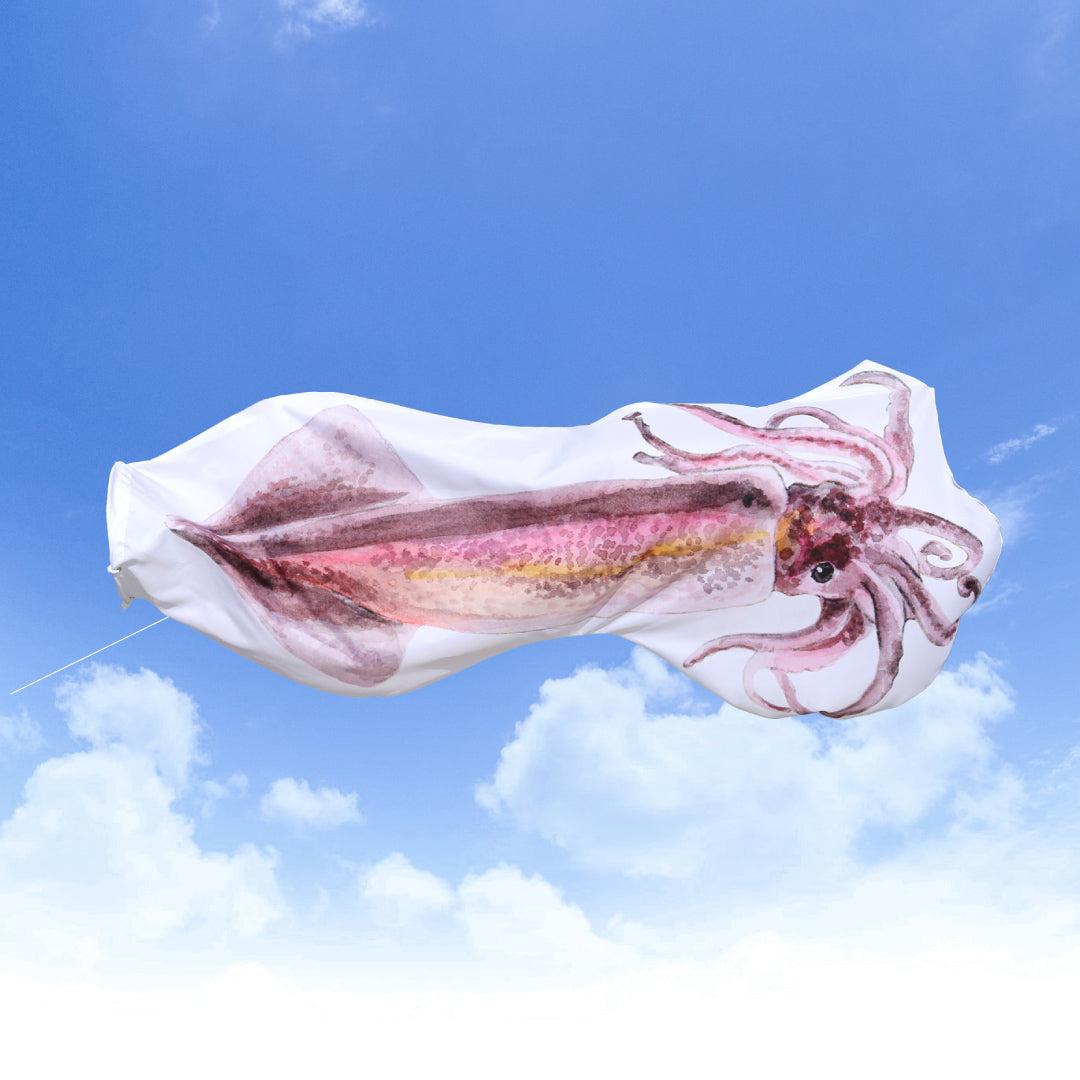 イカ特有の三角形のエンペラ(頭の部分)から胴体足までの独特なシルエットを、風をはらむ立体のぼりとして制作しました。イラストは イラストレーターのカドワキタミが描き、上品でありながらどこかユーモラスで愛らしい表情を元に仕上げました。空を泳ぐ姿は、通りかかる人の目を釘付けにすることは間違いありません。店舗やイベント会場に、雰囲気と美しい雰囲気を感じます。